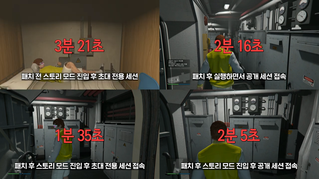 위 스크린샷에 "패치 후 스토리 모드 진입 후 초대 전용 세션 접속"이 1분 35초로 패치 후 로딩 시간중엔 가장 빠른데