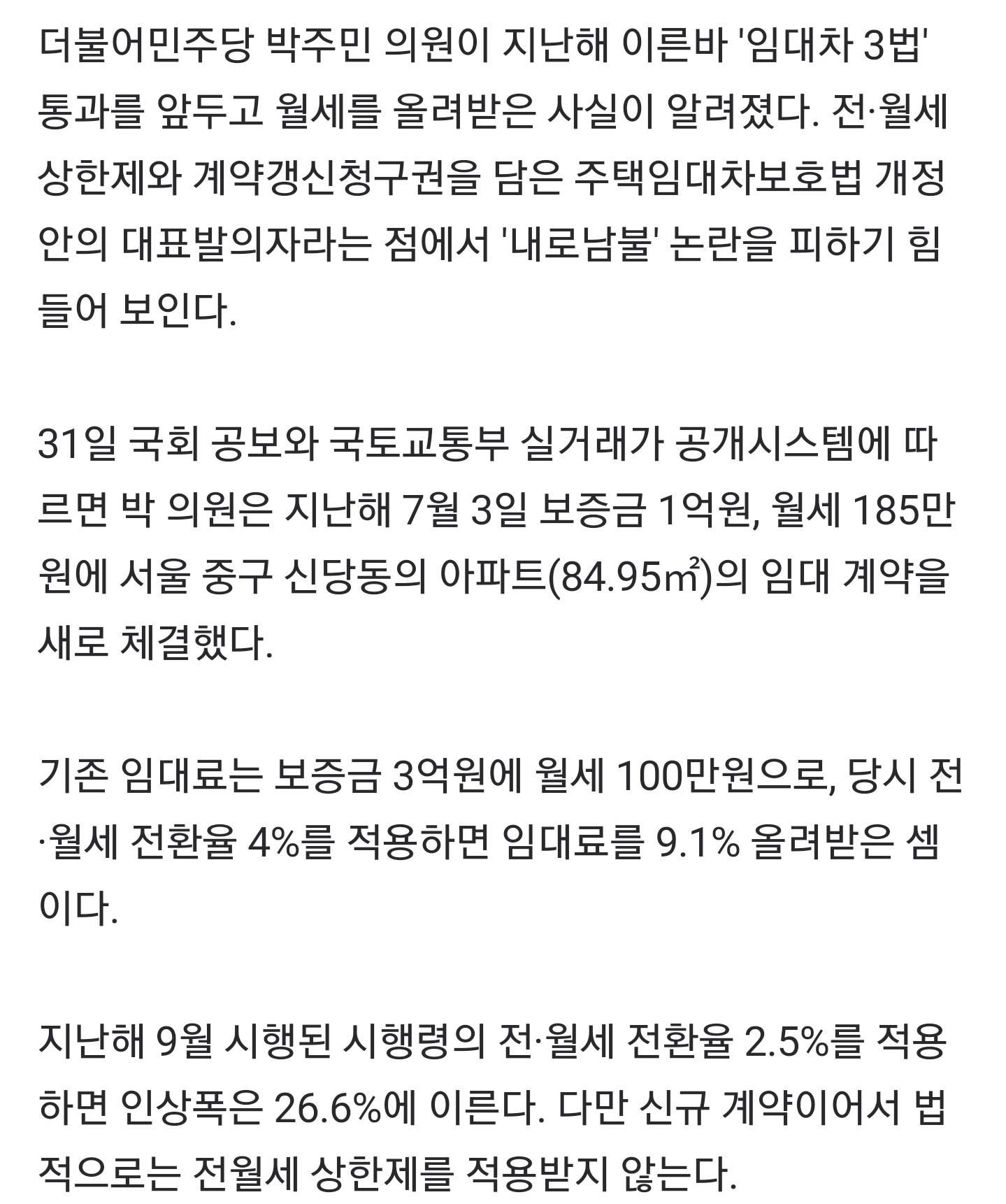 본문에 있네 전:월세=100:4로 하면 9%인상, 100:2.5로 하면 26%인상 참고로 지가 직접 대표발의한 법에 따르면 인상율은 5%로 제한됨^^