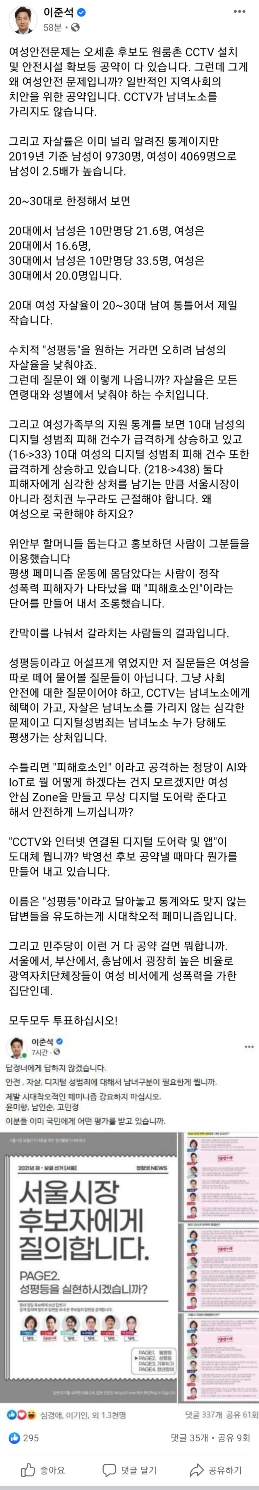 근데 cctv가 뭐? 이게 뭐 폐미니즘 정책임? 심지어 밑에 이준석 페북도 있네. 지금도 공약에 있다고. 그걸 박도 언급한 공약이라는게 대체 지금 논의에 무슨 의미가 있는거임? 그냥 태클을 위한 태클로밖에 안보이는데. 그래서 의도를 묻는거임