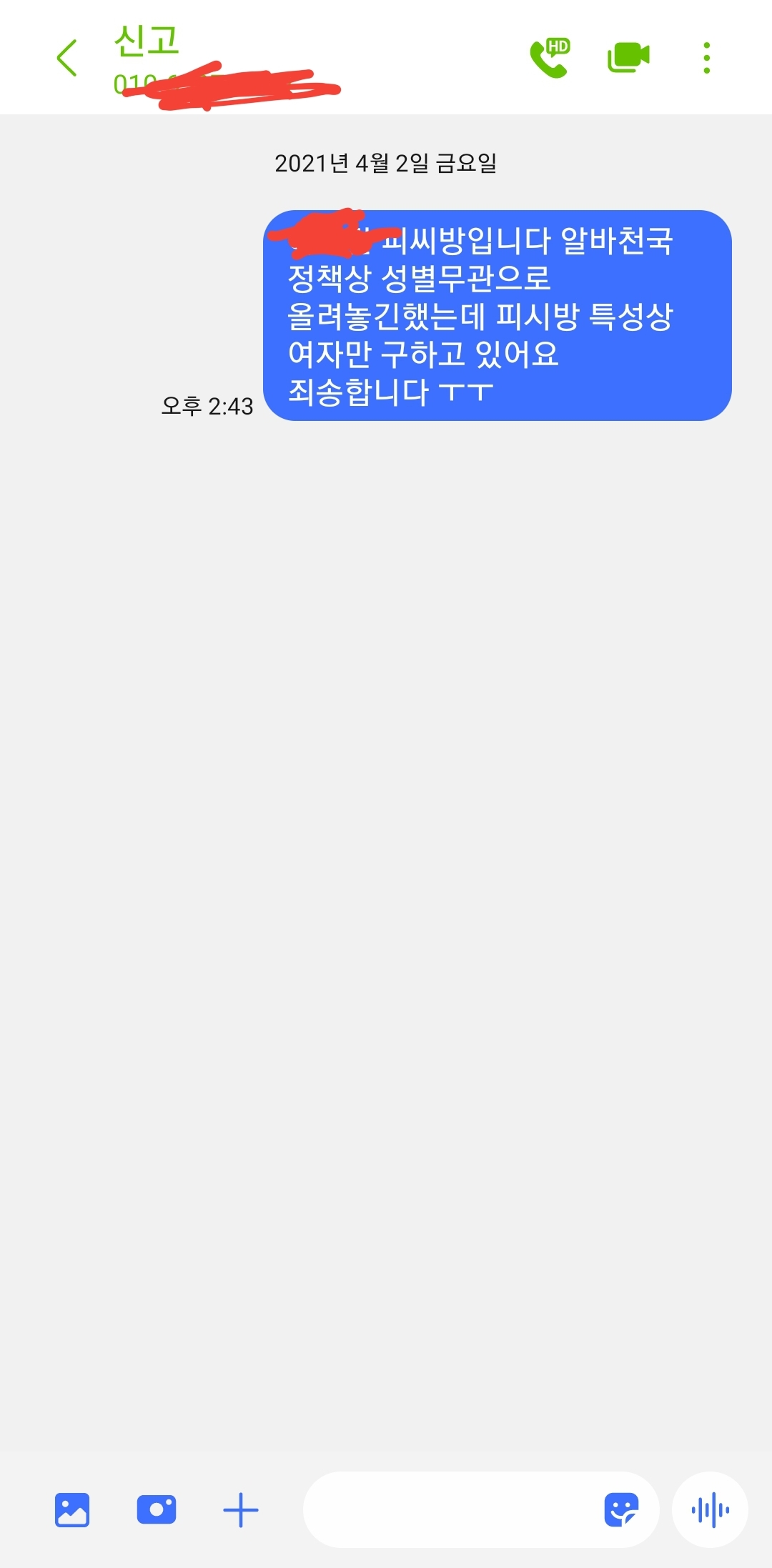 이렇게 문자보내니까 알바천국에 신고해서 정지먹을뻔했네