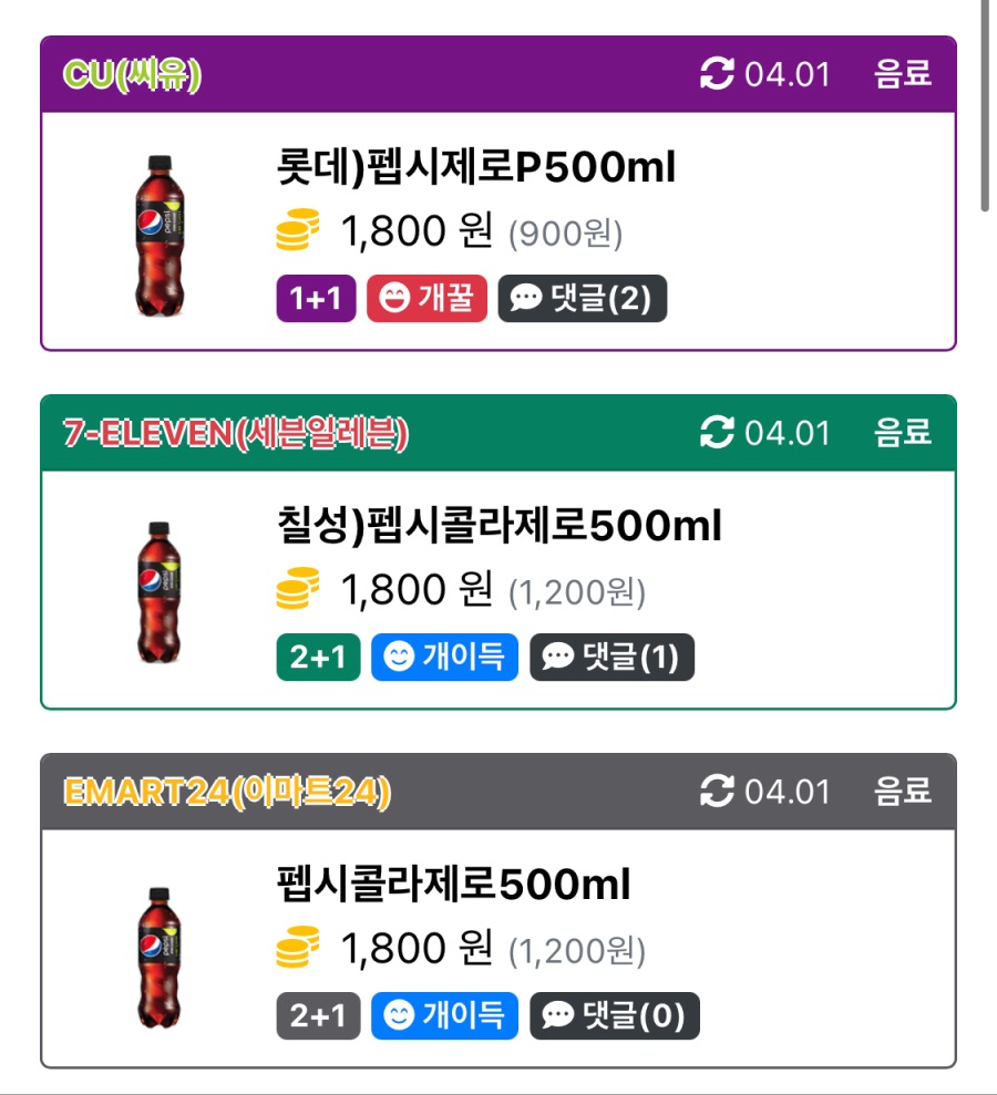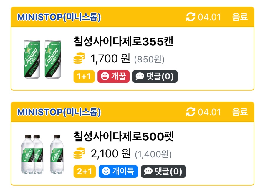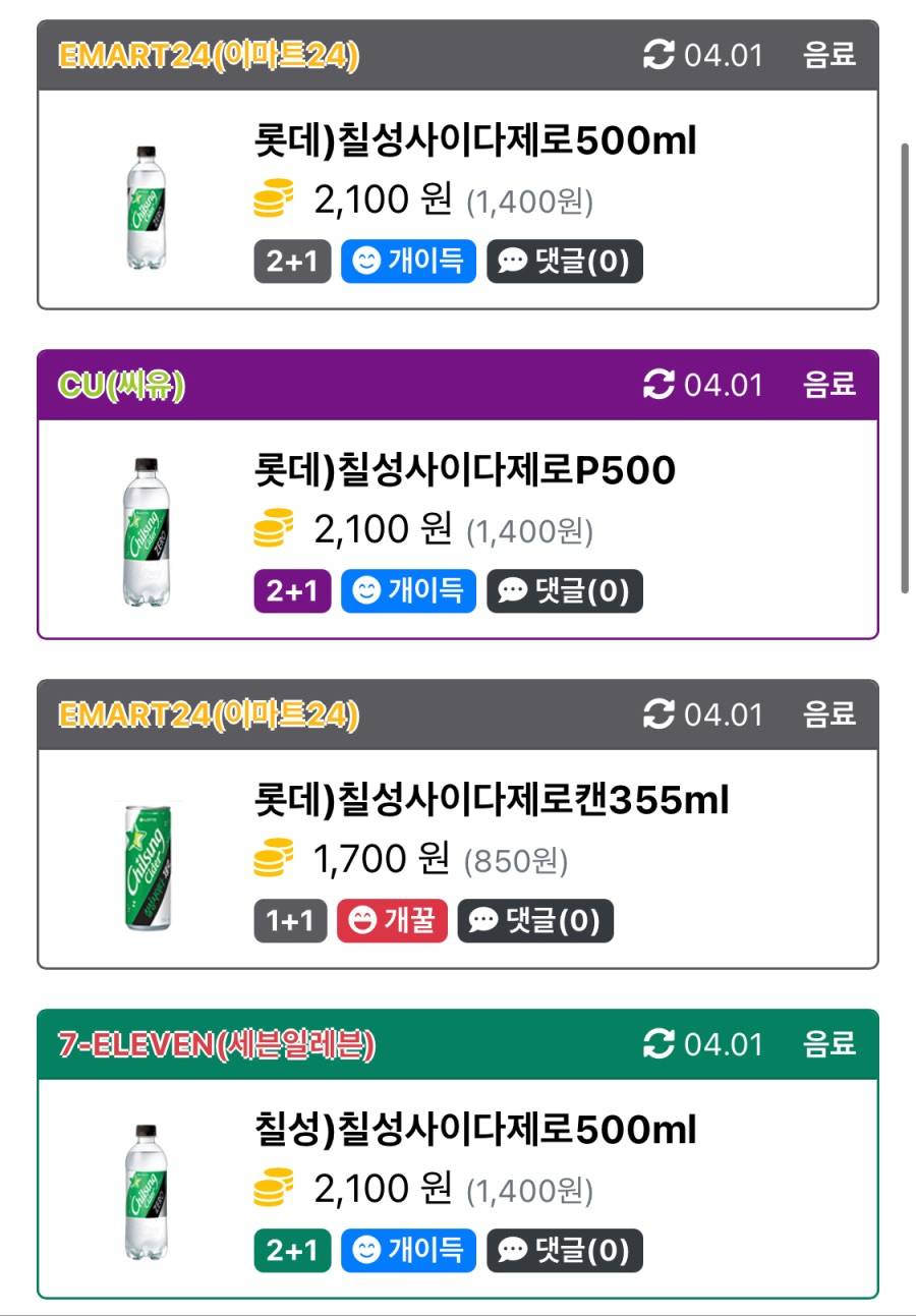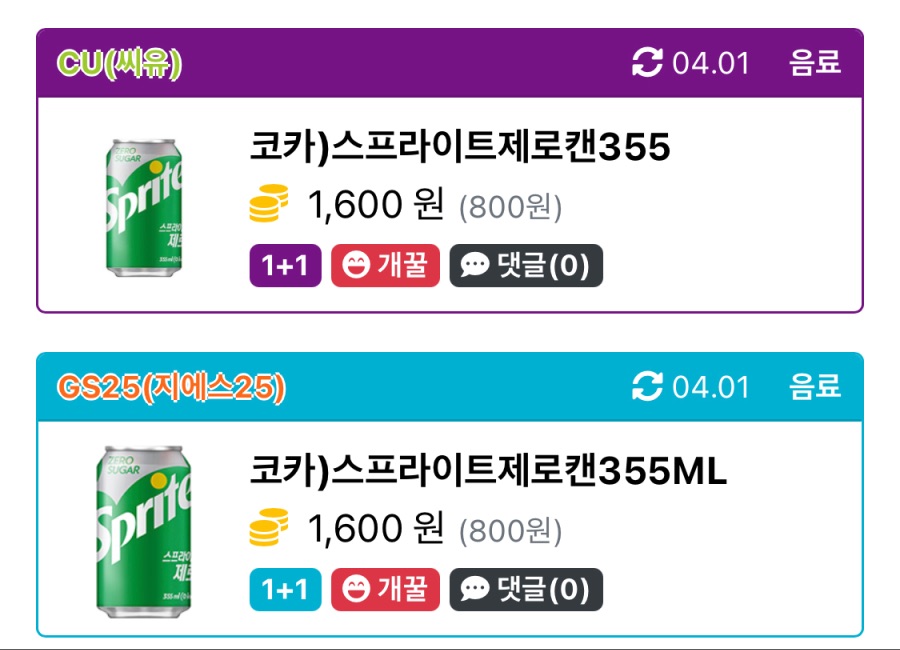 스프라이트 제로 뚱캔 1+1은 씨유나 GS25
