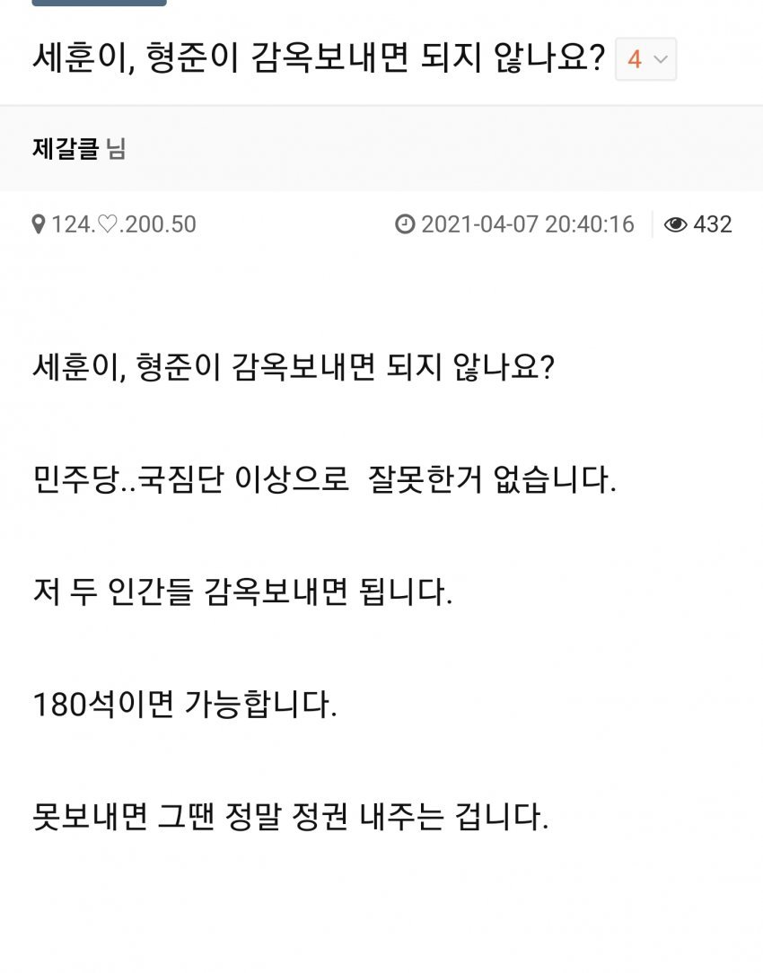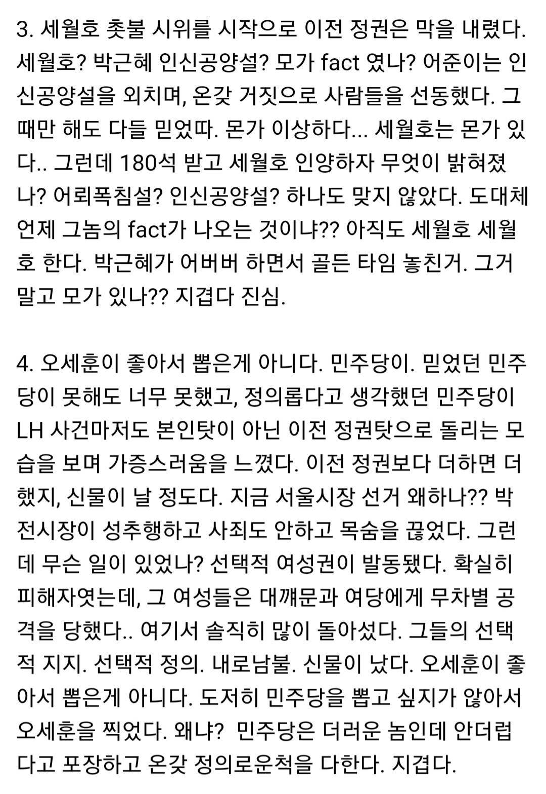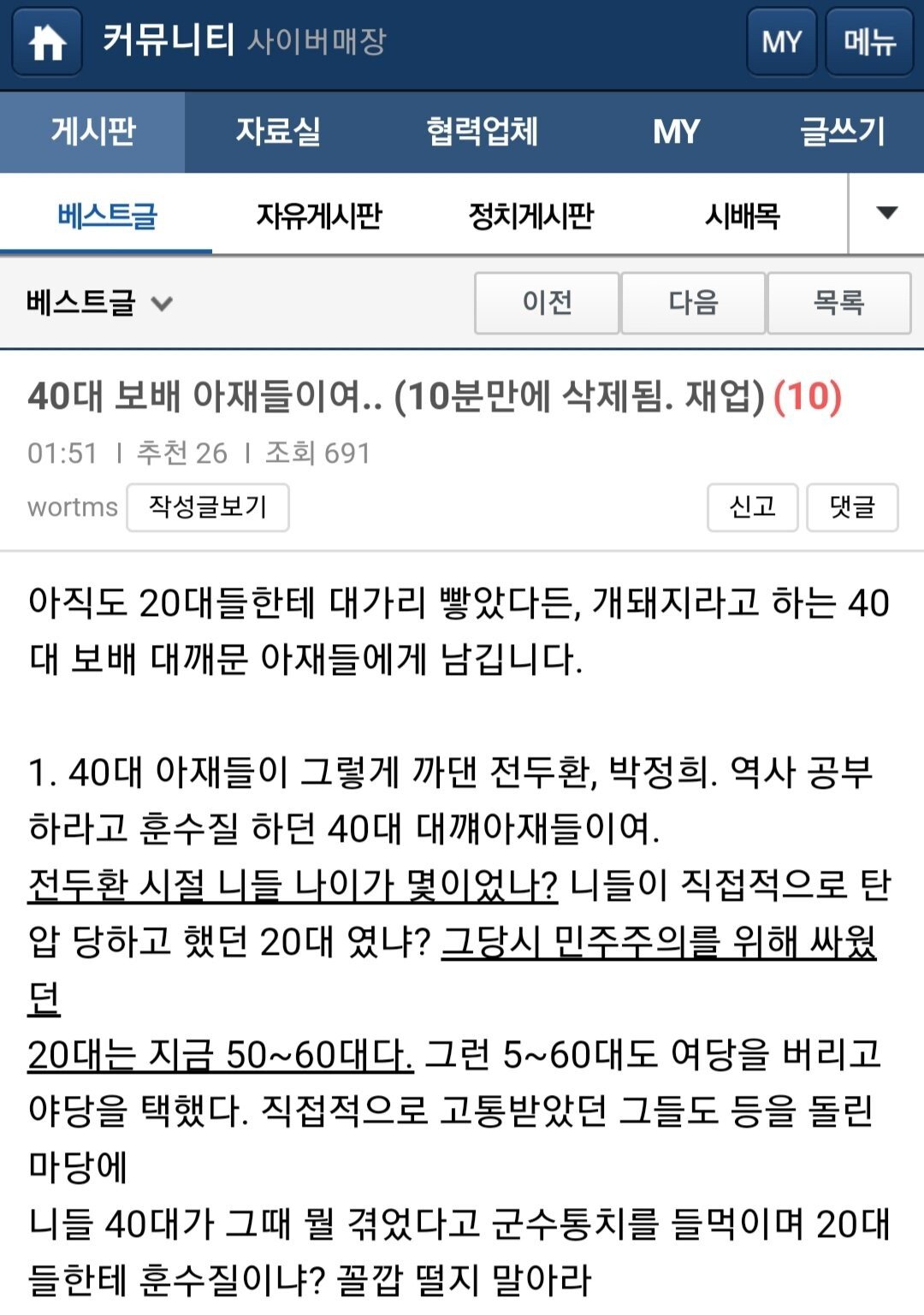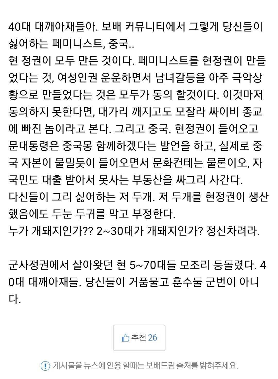 40대는 저기에 더해서 산업화시대를 겪은 60대 이후 세대를 독재 정부의 세뇌의 산물이라 여긴다는것임.