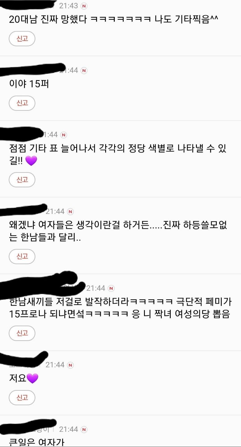근데 기타 15% 긁어모아도 1% 겨우 되는데 ㅋㅋ 일단 인구 자체도 20대가 밀리는데 투표율은 과연 얼마나 나왔을까 싶다