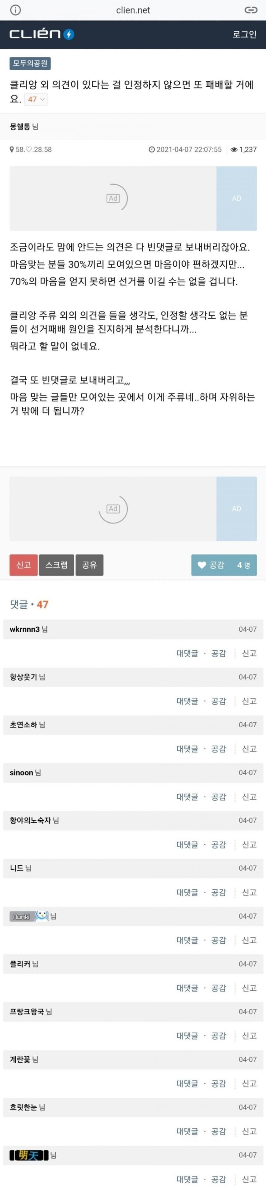 틀니앙에서는 지들 심기에 거슬리는 글 쓰면 댓글내용 없는 빈 댓글 달아서 "이거 좆같은글이에요" 하는거임.
