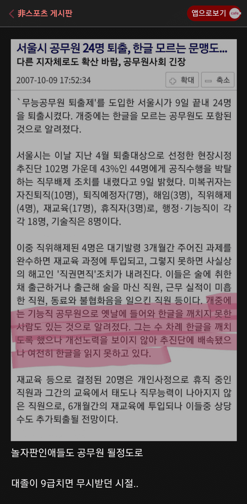 근데 아무리 기능직이라도 어찌 한글을 못 읽을 수 잇나 ㄷ ㄷ