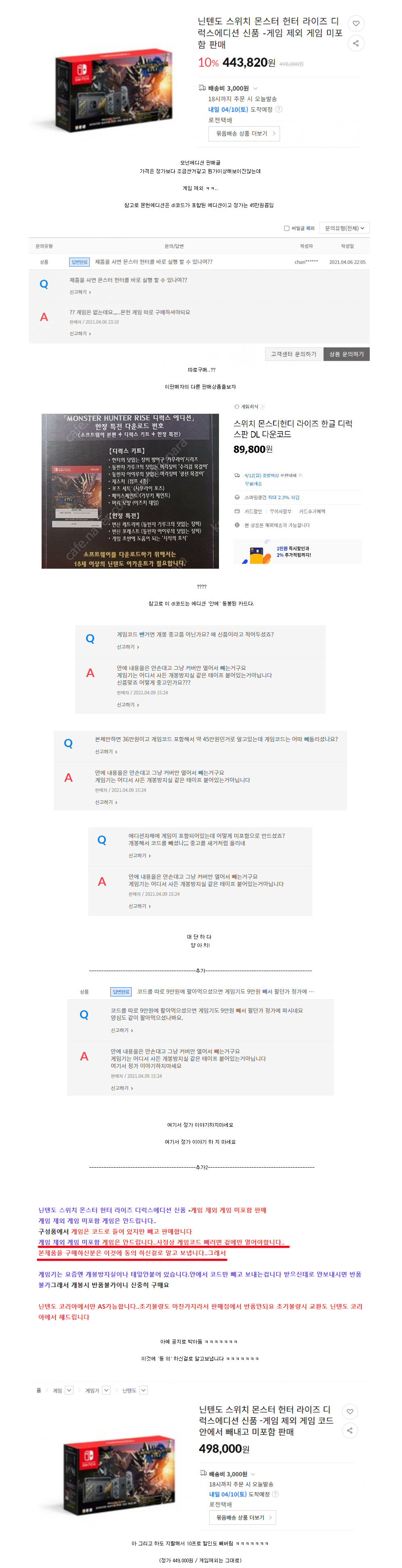 이거 마침 나도 어제 몬헌 라이즈 사려다보니 몬헌에다션 나왔길레 검색해봤는데 오 아직도 정가에 파는데가 있네? 하고 클릭하니 게임제외ㅋㅋㅋㅋㅋ 포함버전 48~49면 사서 살까 고민했는데 몬헌에디션이 그냥 그래이컬러보다도 구려서 패스함