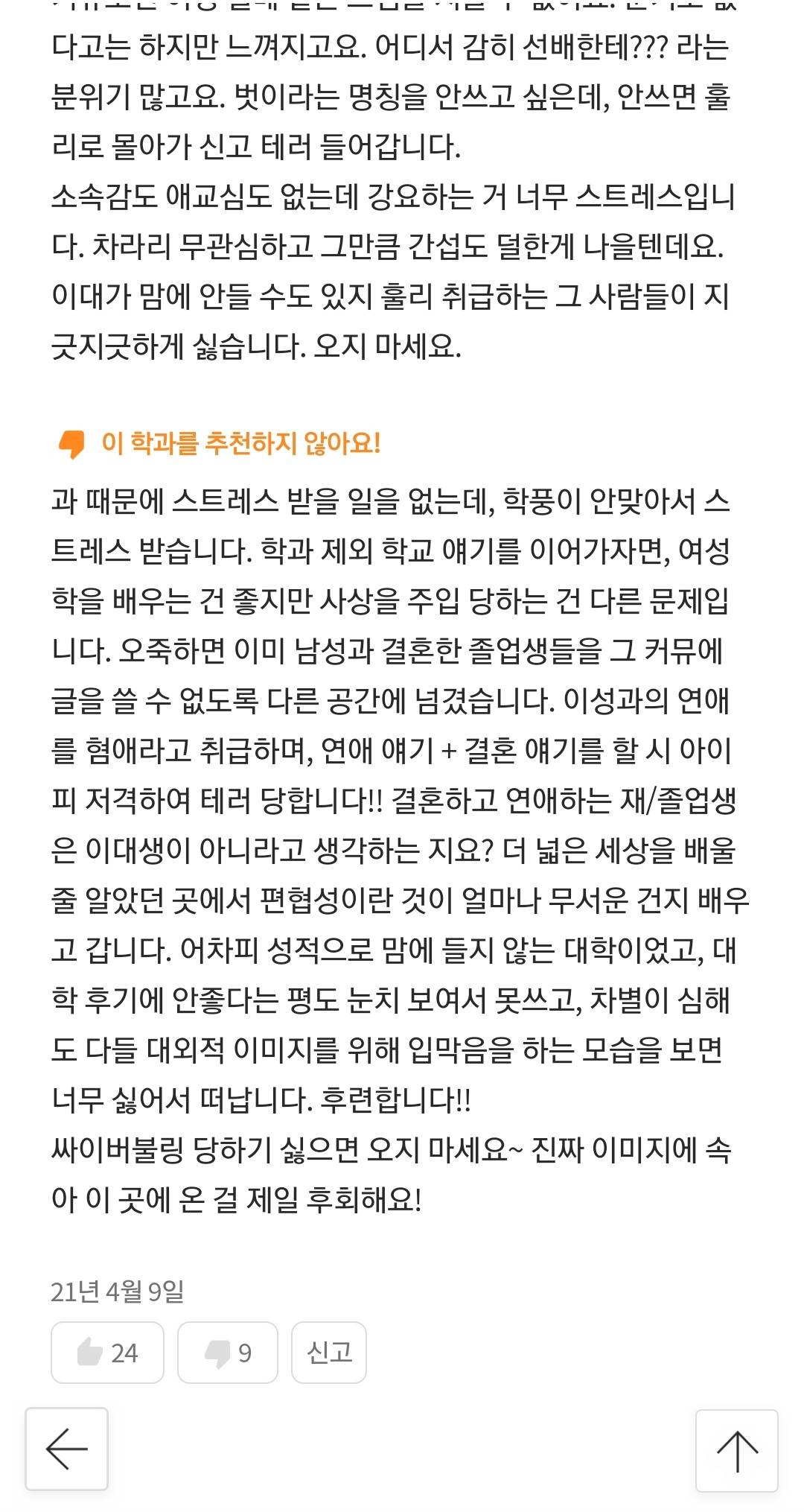 이미 회사안팎에서 나오기시작함. 이번에 동아제약봣지? 채용시에도 여대출신이면 사장이 사인할때 0.1초라도 멈칫하게 되고 면접관이 고개 갸우뚱 한번더할거임. 부서내 인사배치받을때도 여대출신이면 이제 색안경부터 끼고볼거임. 심지어 근래 여대출신은 그냥 너 메갈년이지? 하고 낙인박아도 적중율이 7할은될거임. 자업자득이지. 페미는 결국 여자들이 직접거르기시작해야 음지로 기어들어갈거야