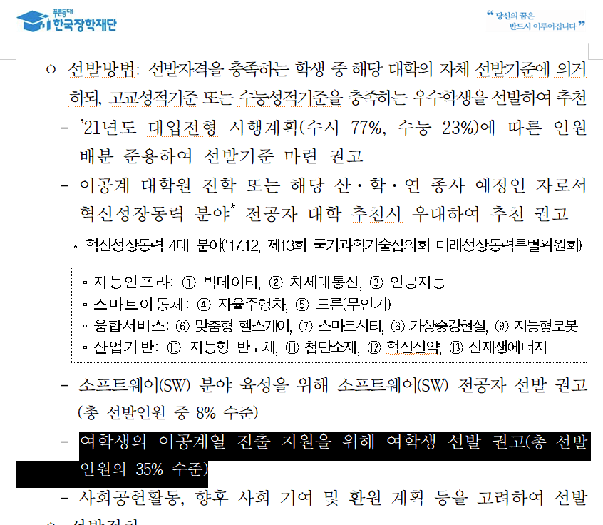 한국장학재단이 배포한 '2021년도 국가우수장학금(이공계) 업무처리기준' 문서에 따르면,