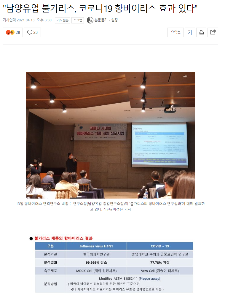 항바이러스 면역연구소 박종수 연구소장(남양유업 중앙연구소장)은 이날 '불가리스의 항바이러스 연구성과' 발표에서 "불가리스 발효유 제품의 실험실 실험 결과, 인플루엔자바이러스(H1N1)를 99.999%까지 사멸하는 것을 확인했으며, 코로나바이러스(COVID-19) 억제효과 연구에서도 77.8% 저감효과를 확인했다"고 발표했다. 이들 연구결과는 각각 한국의과학연구원, 충남대 수의과 공중보건학 연구실에서 개의 신장세포와 원숭이 폐 세포를 통해 실험한 결과 도출됐다.