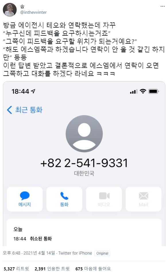 소속사에도 전화하는 깨어있는여성 ^^