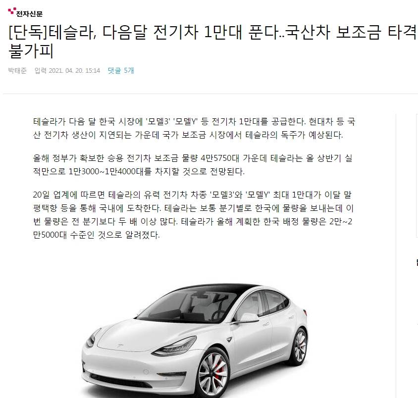 [단독]테슬라, 다음달 전기차 1만대 푼다..국산차 보조금 타격 불가피 (daum.net)