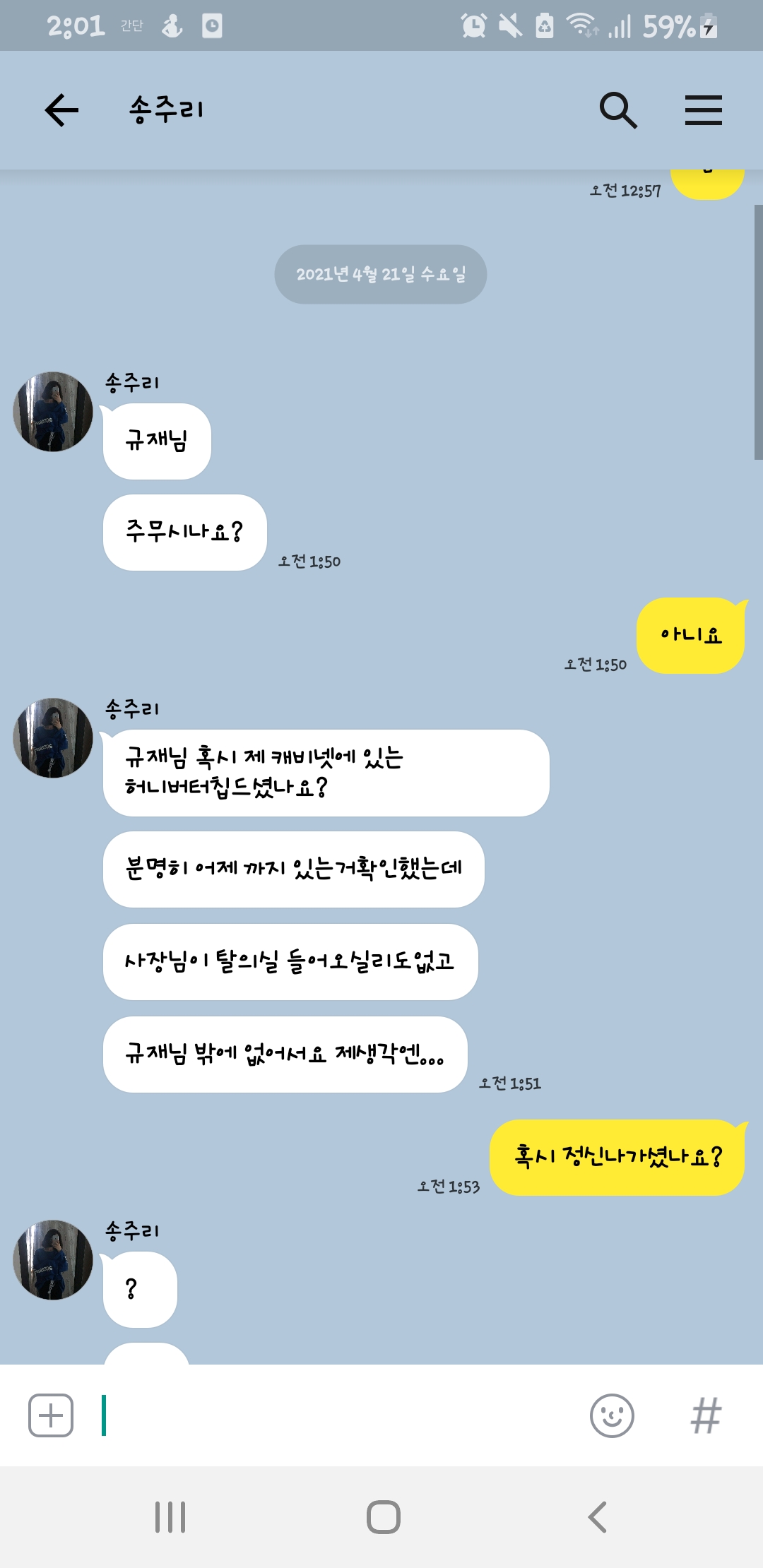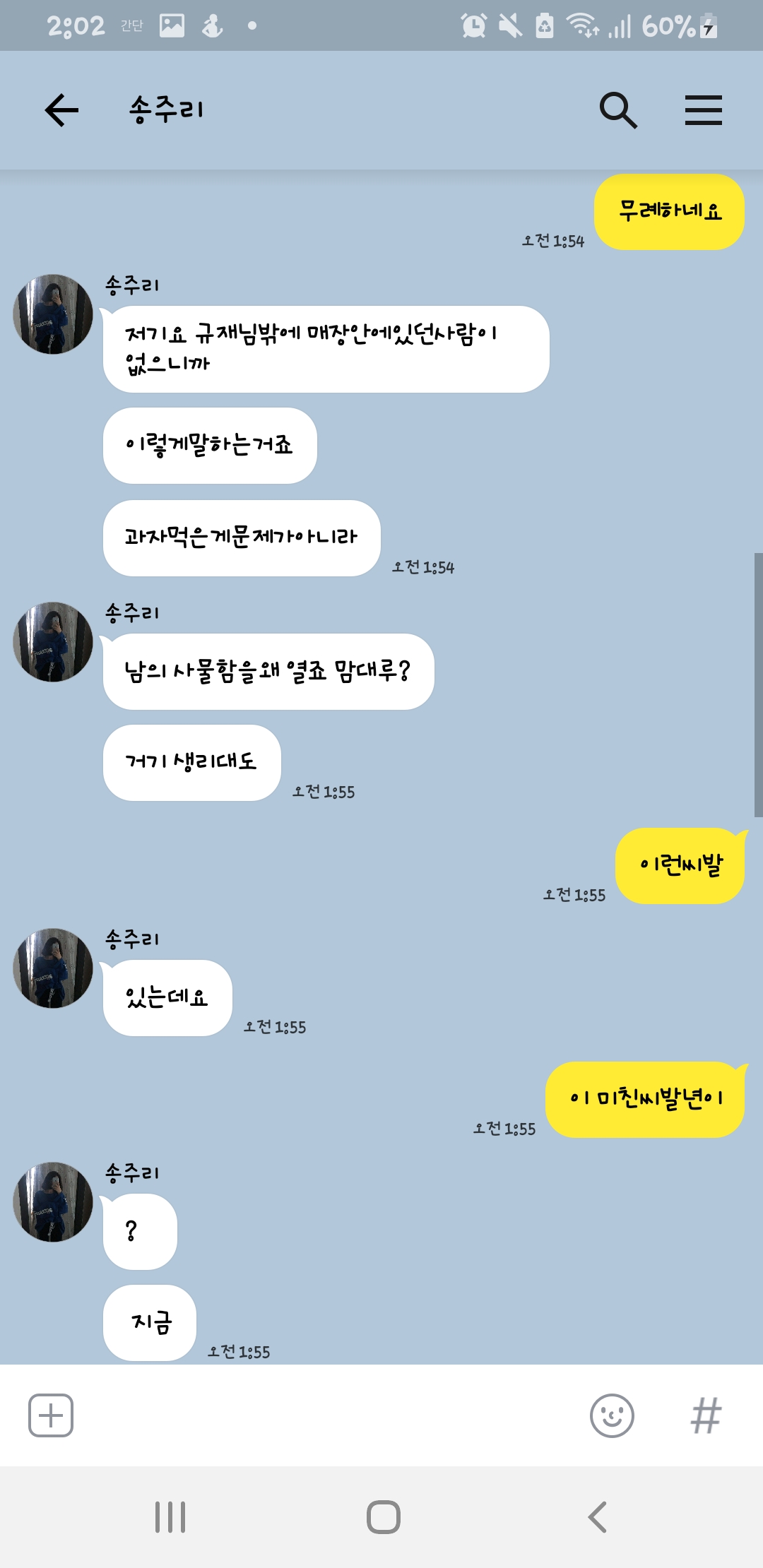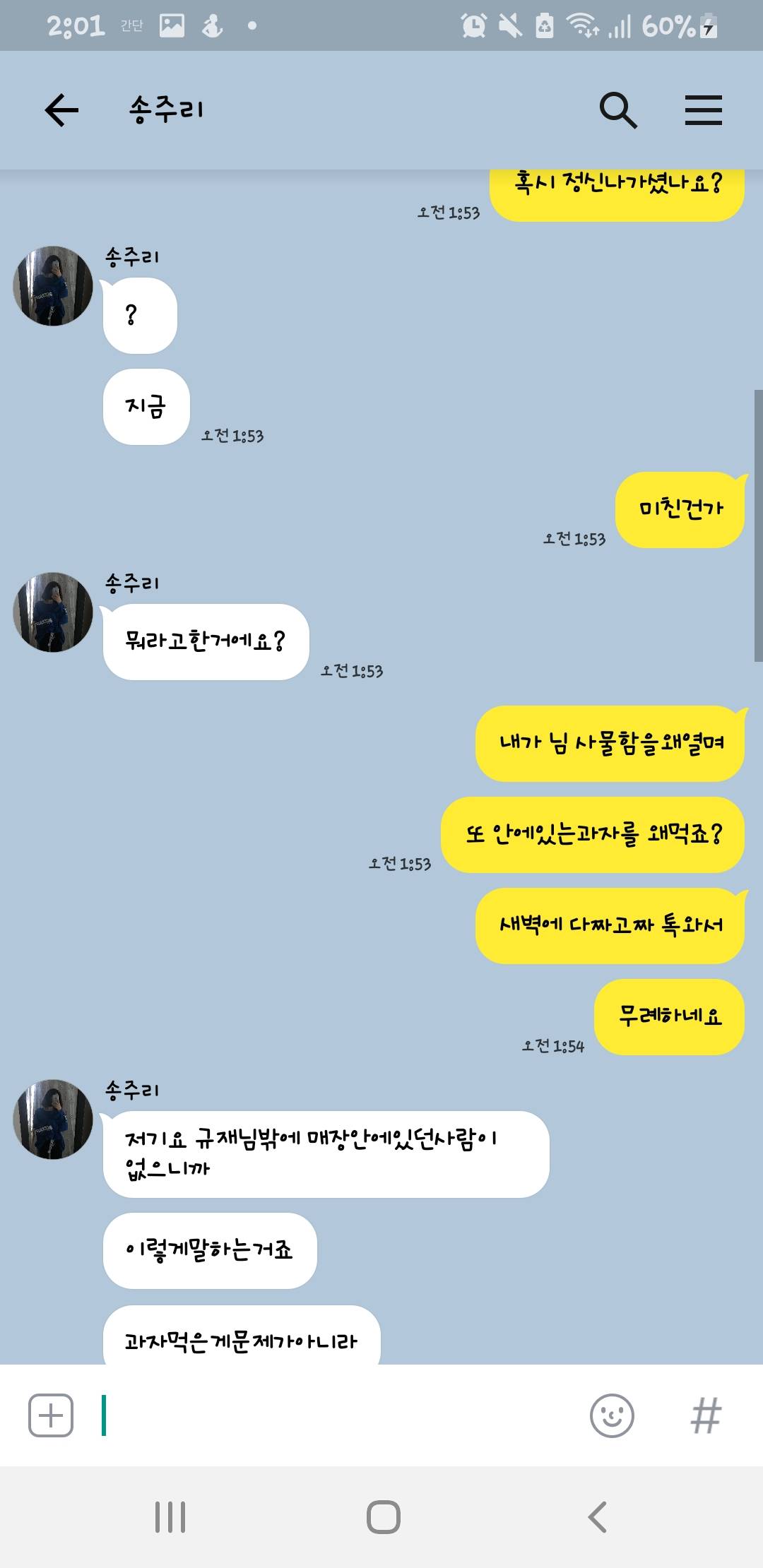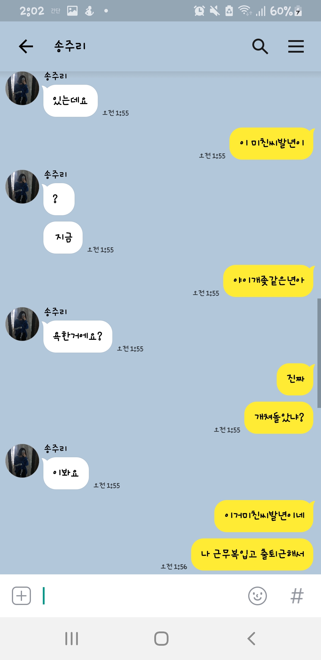 새벽 1시 50분에 저딴거 물으면 급발진 할만하지 자고 있다가 저런거 물어보면 존나 빡칠것 같은데 ㅋㅋ