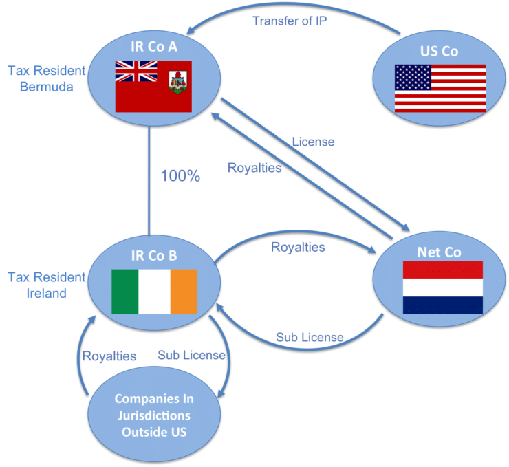 3. 버뮤다에 차린 회사가 아일랜드에 자회사 (이하 아일랜드1)을 세우고, 네덜란드에 차린 회사가 아일랜드에 자회사 (이하 아일랜드2)를 세운다.