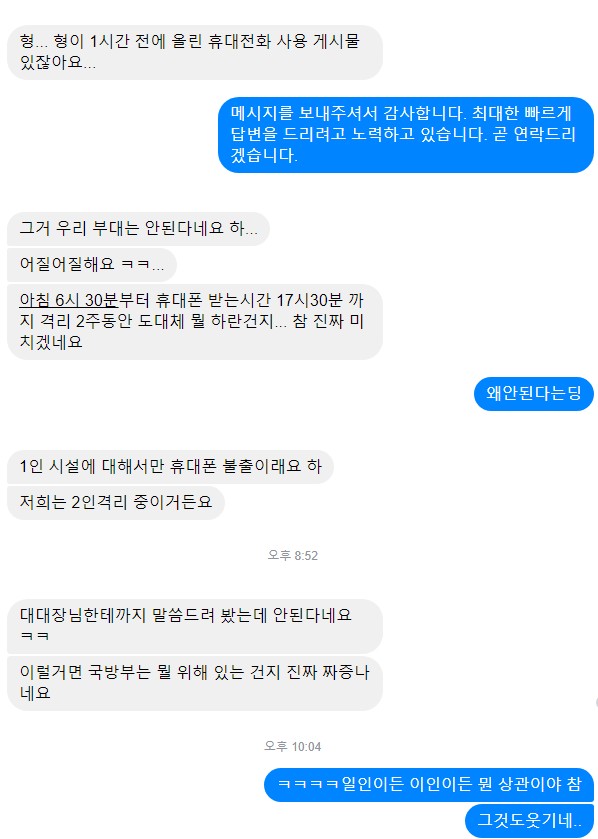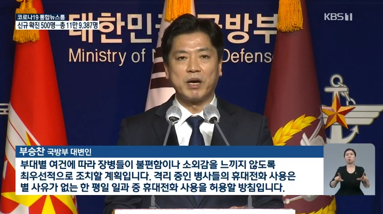 격리 중인 병사들 일과중에 폰사용 허용이라고 했는데