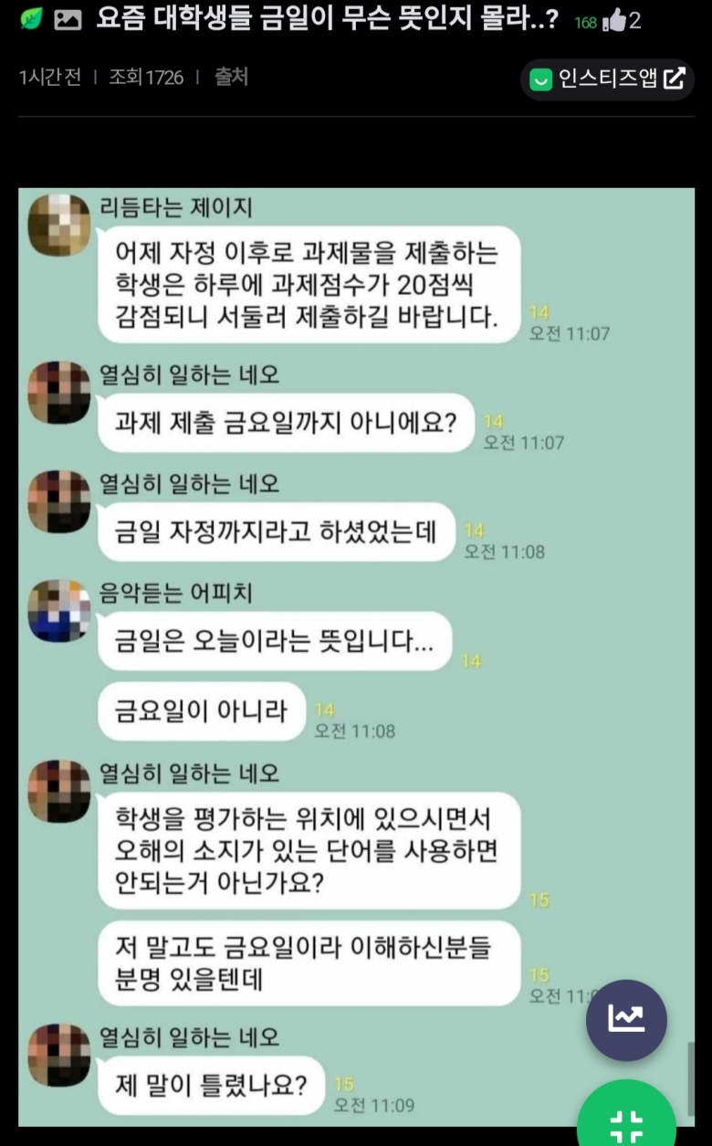 금일 익일 이런말 옛날식 한자표현이라고 우리말 쓰는 추세에 따라 나도 서류업무할때 오늘 내일 다음날 등등 쉽게 쓸려고 의식적으로 예전부터 쓰긴 하는데 그렇다고 저렇게 금일이라는 단어 썼다고 교수 평가질 하는건 아니지 20점 감점될껄 왜 스스로 점수를 더깎지 ㅋㅋ