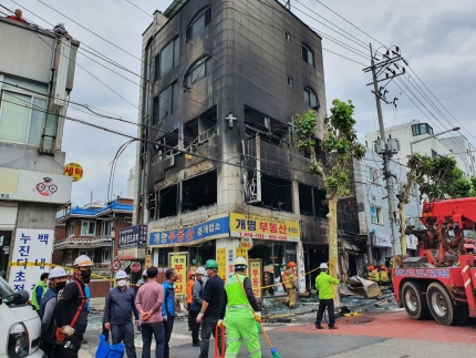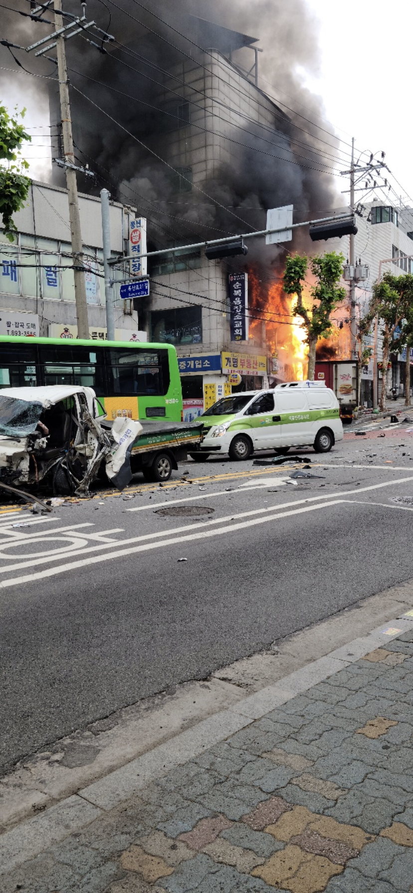 트럭이 건물 1층 외벽을 들이받는 과정에서 가스 배관을 건드렸고, 가스 누출로 폭발과 함께 건물에 화재가 났다. 이 사고로 2명이 숨지고 트럭 운전자 등 6명이 부상을 입었다.