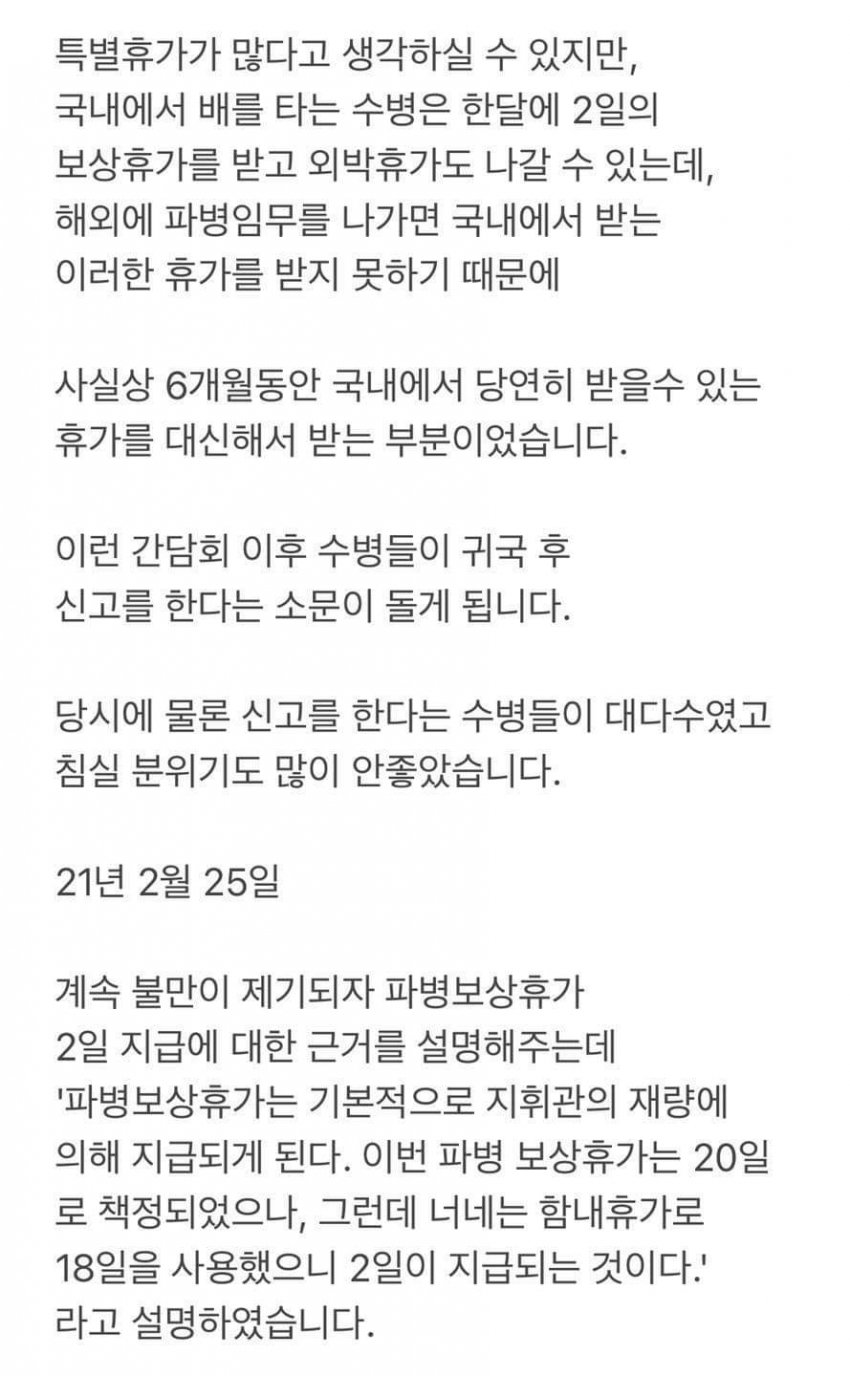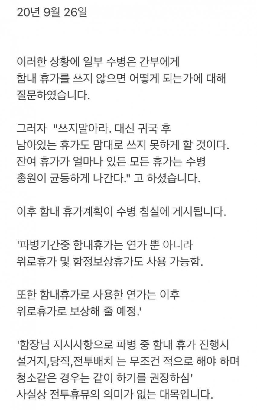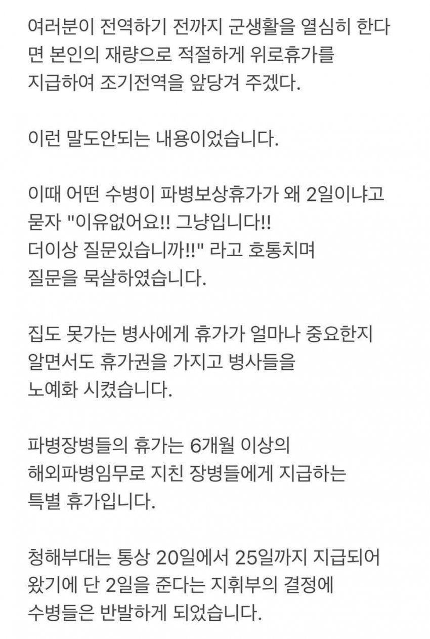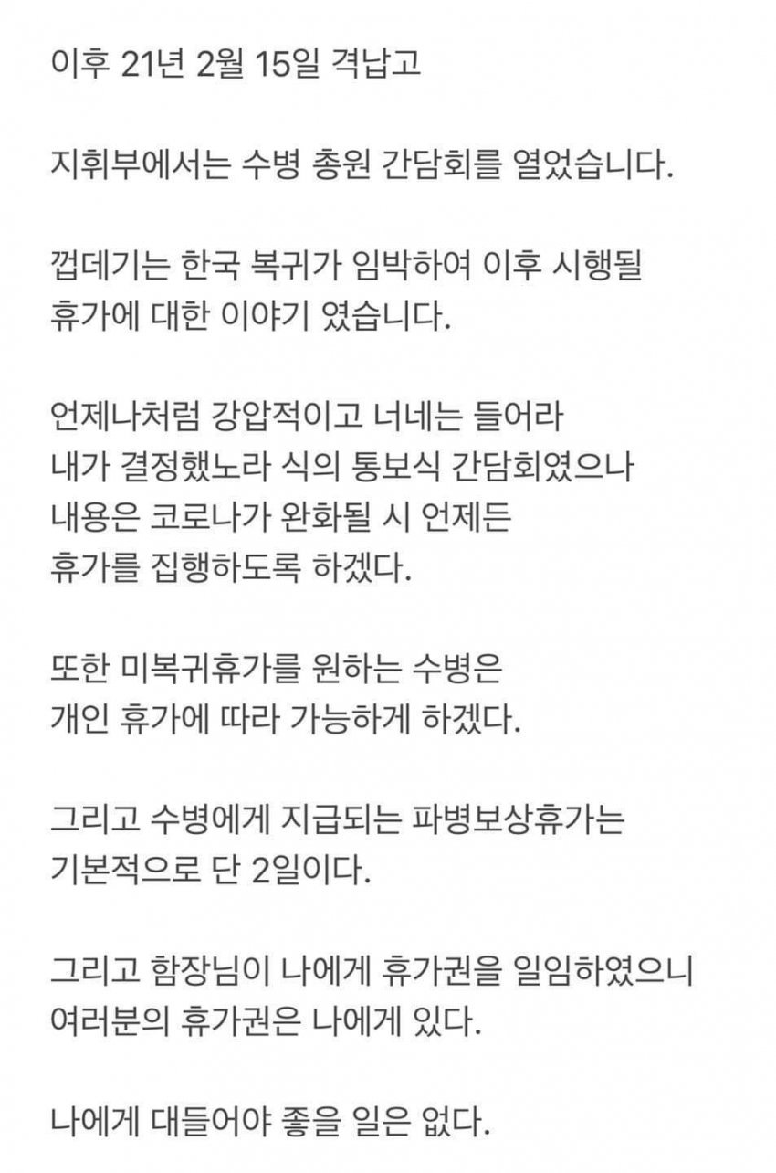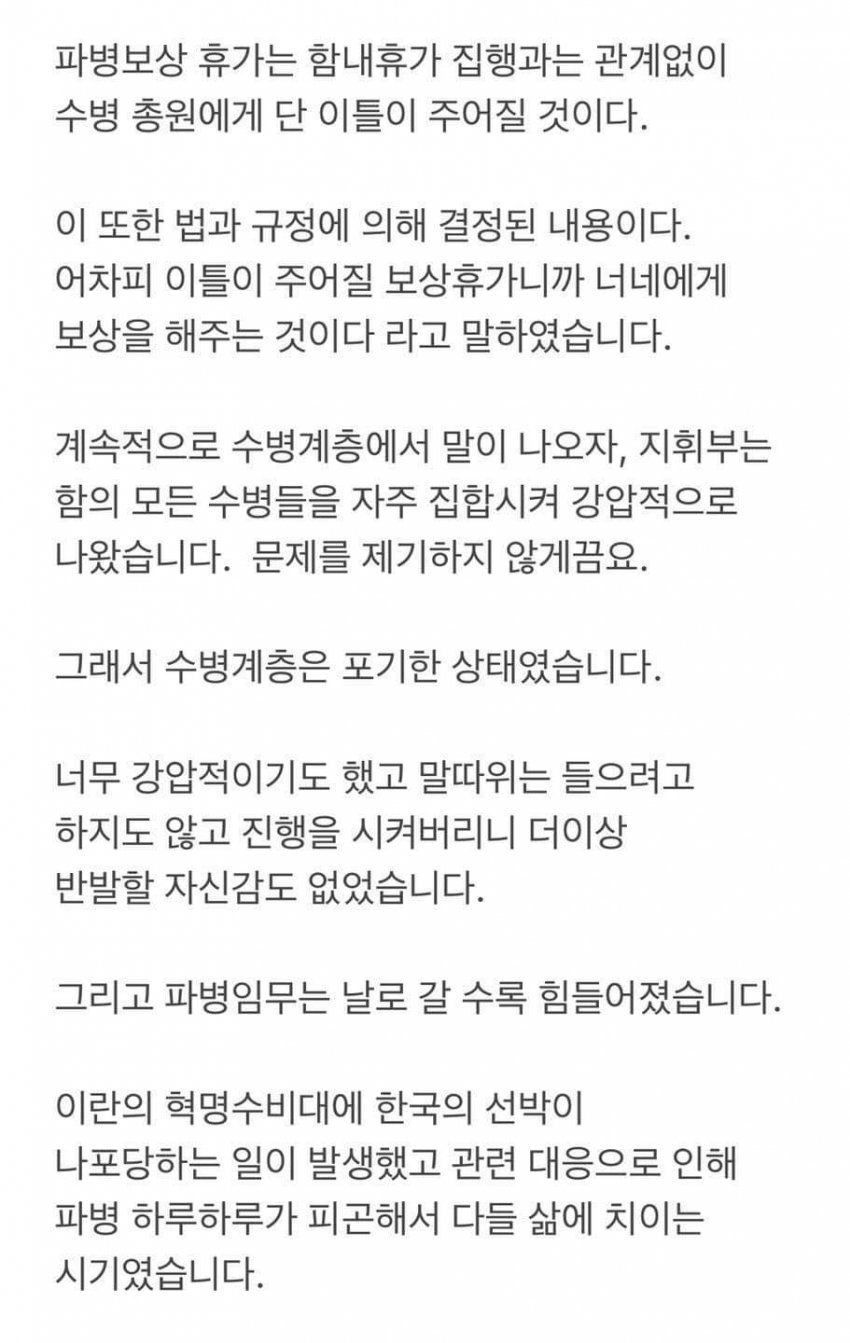 파병가서 고생하는 애들 휴가를 함장을 비롯한 간부새끼들이