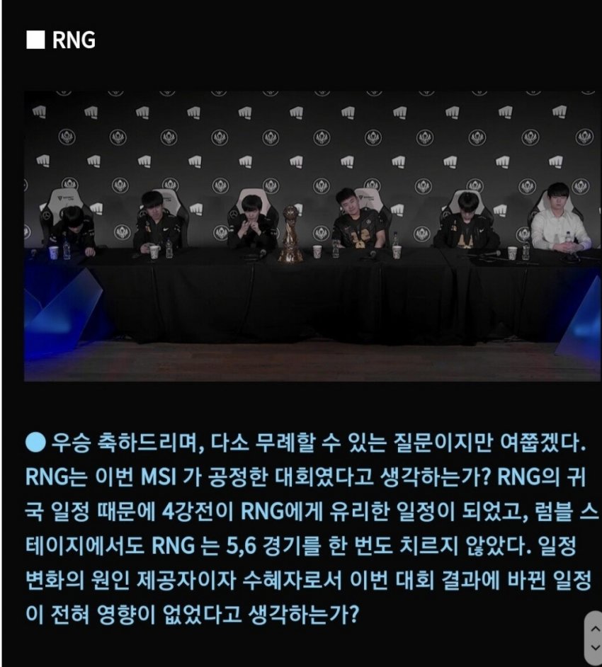 쟤들 잘못은 아닐테니 우승한 자리에서 찬물 끼얹는 저런 질문은 너무 예의없는 행위인거같지만 짱개에게 예의 차리는건 사치인거같기도 하도