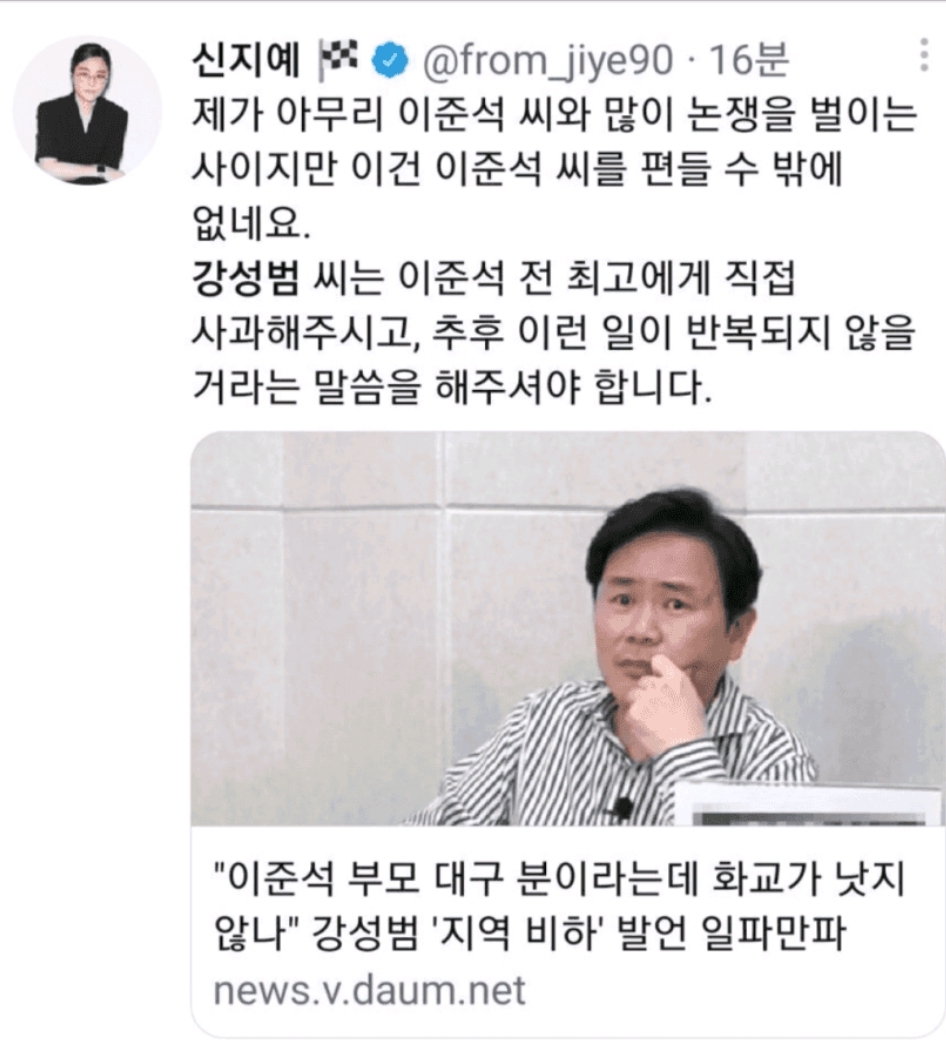 신지예는 이준석하고 논쟁을 하는 사이가 아니고 이준석한테 혼나는 사이지 지혼자 쉐도우복싱 해놓고 뭘 논쟁 ㅋㅋ