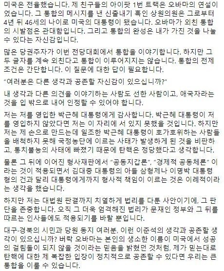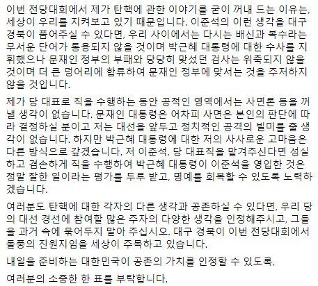 박근혜 사면은 요구할 생각 없다. 어차피 요구하나 안하나 문재인이 자기 유불리에 따라 정치적으로 판단할건데 괜히 대선앞두고 태클걸 거리 제공하지 않겠다. 그점 이해해달라.