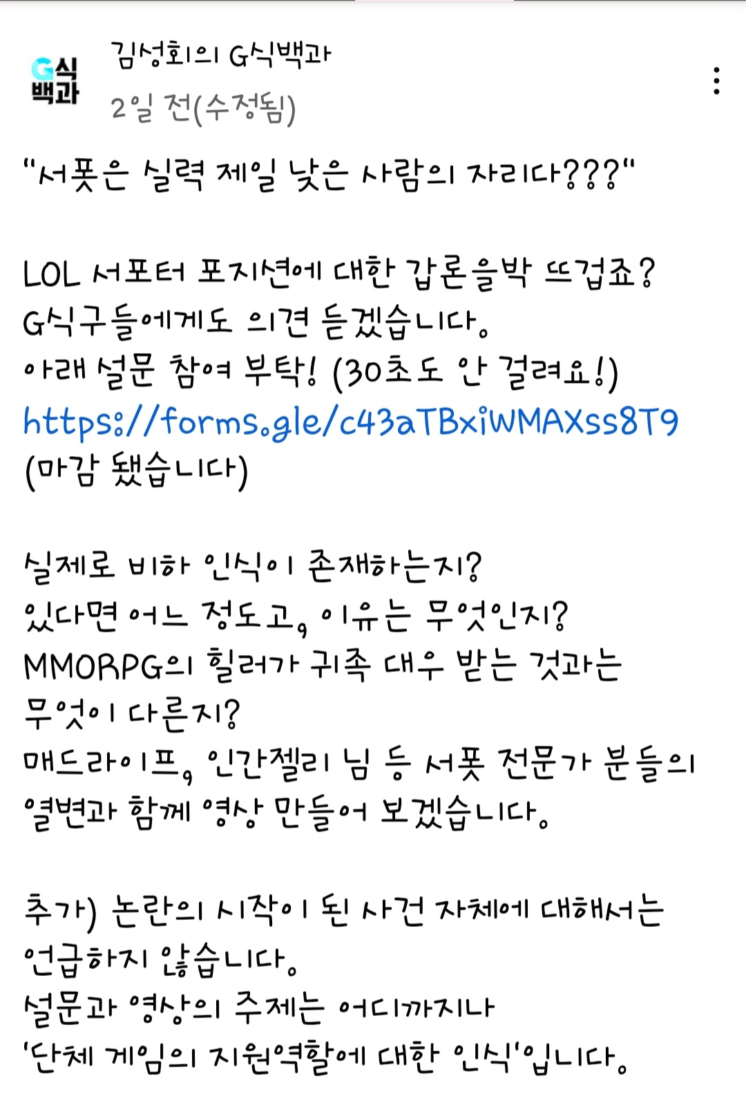 후로게이머 새끼들이 내로남불까지 하면서 까는거 보면 확실히 서포터 비하는 만연한듯