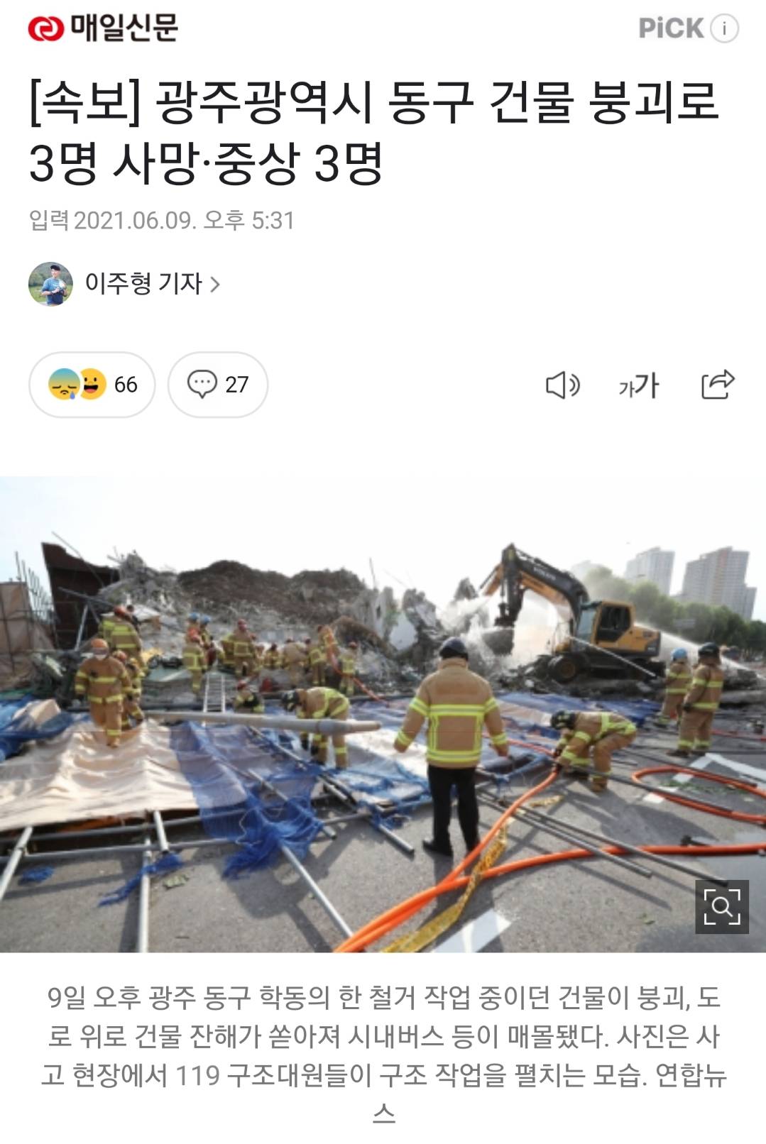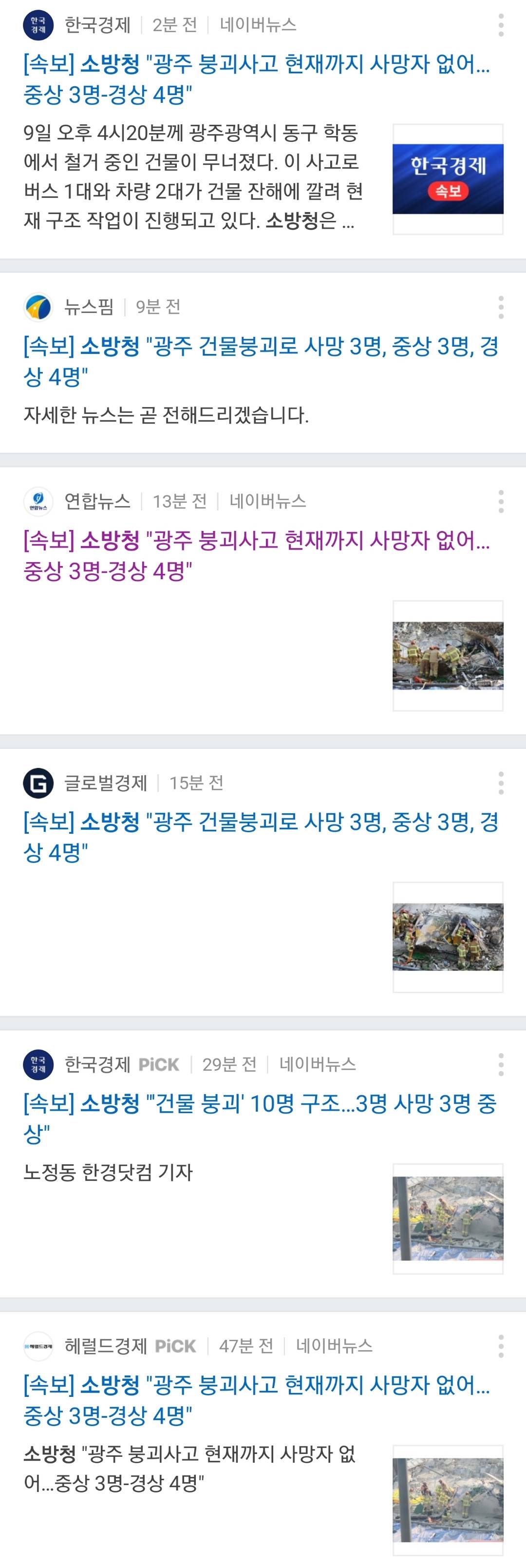 연합뉴스 [속보] 소방청 "광주 붕괴사고 현재까지 사망자 없어…중상 3명-경상 4명"