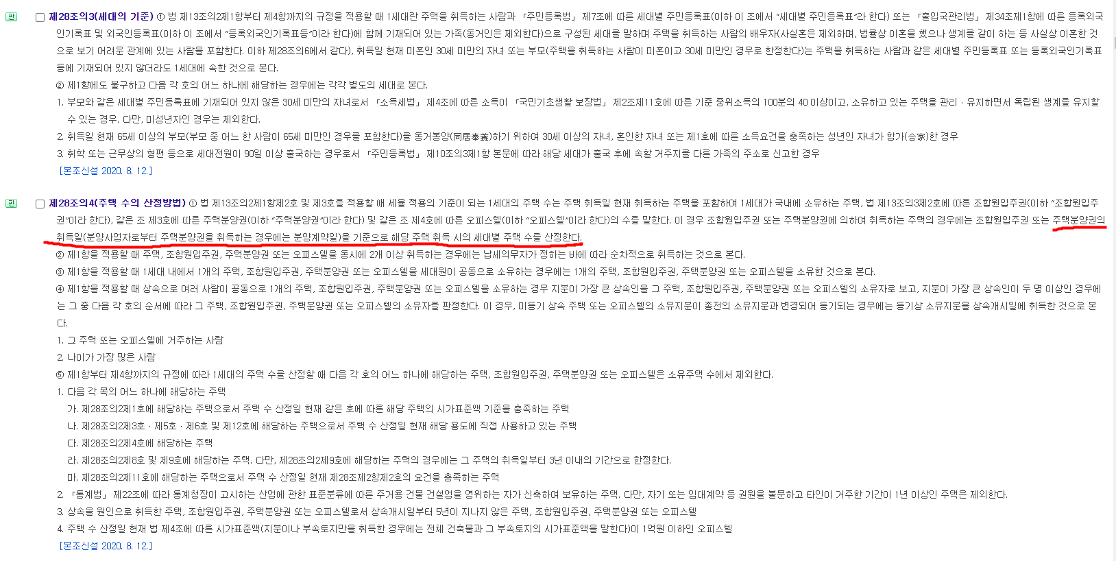 ① 법 제13조의2제1항제2호 및 제3호를 적용할 때 세율 적용의 기준이 되는 1세대의 주택 수는 주택 취득일 현재 취득하는 주택을 포함하여 1세대가 국내에 소유하는 주택, 법 제13조의3제2호에 따른 조합원입주권(이하 “조합원입주권”이라 한다), 같은 조 제3호에 따른 주택분양권(이하 “주택분양권”이라 한다) 및 같은 조 제4호에 따른 오피스텔(이하 “오피스텔”이라 한다)의 수를 말한다. 이 경우 조합원입주권 또는 주택분양권에 의하여 취득하는 주택의 경우에는 조합원입주권 또는 주택분양권의 취득일(분양사업자로부터 주택분양권을 취득하는 경우에는 분양계약일)을 기준으로 해당 주택 취득 시의 세대별 주택 수를 산정한다.