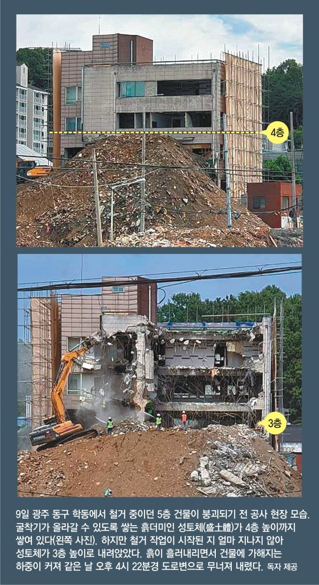 백솔건설 관계자도 “현대산업개발 측이 ‘먼지로 인한 민원 제기가 우려되니 건물을 하루 만에 모두 철거하라’고 했다”며 “철거를 서두르며 물을 평소보다 많이 뿌려 성토체가 무너져 내린 것”이라고 주장했다.