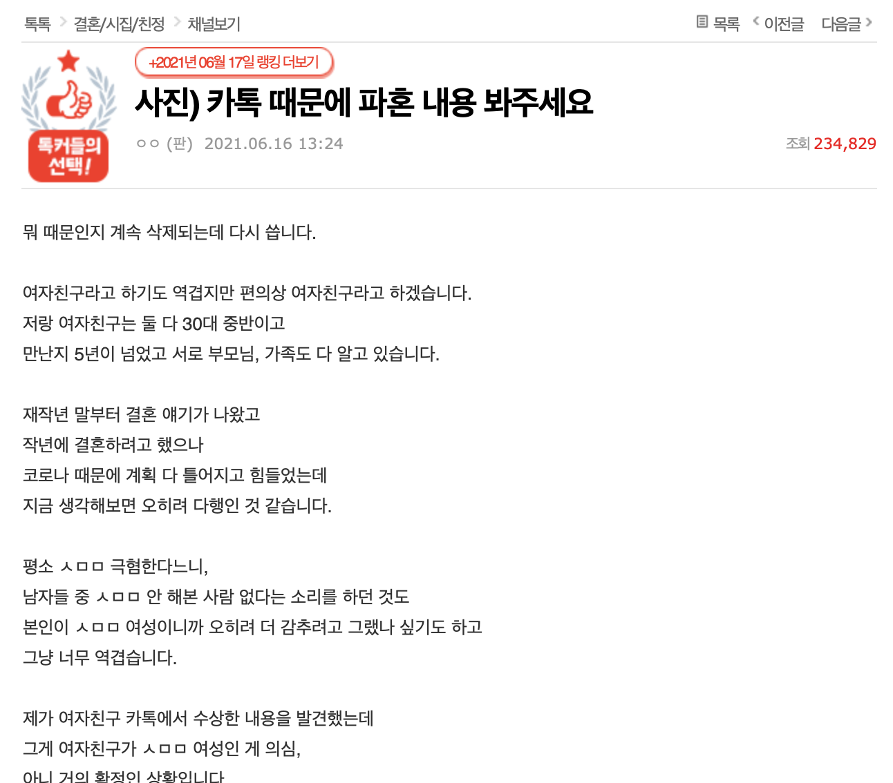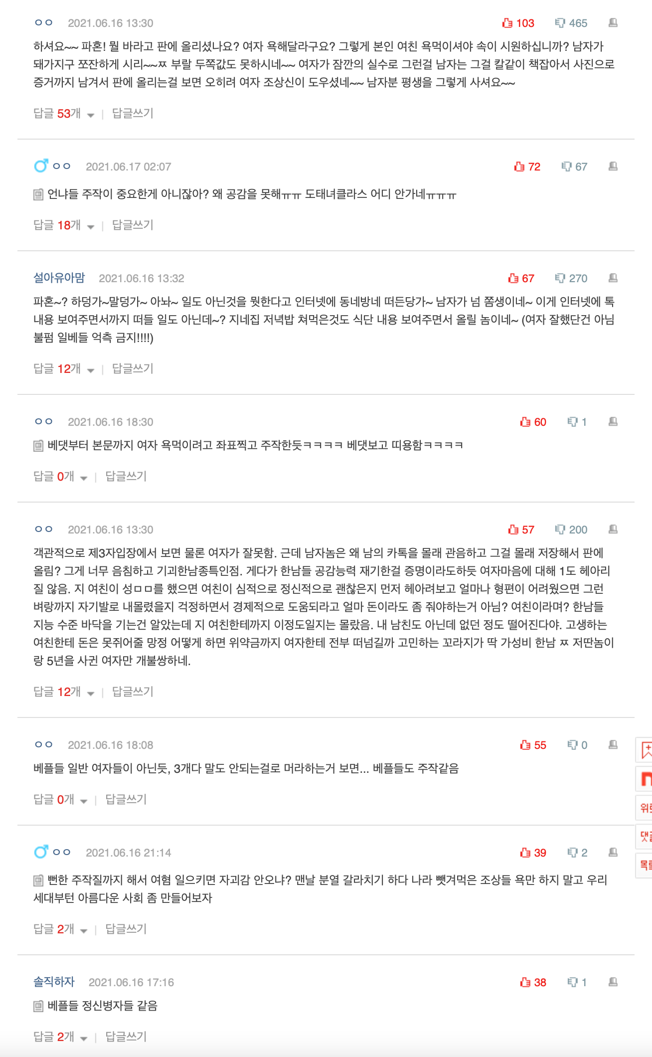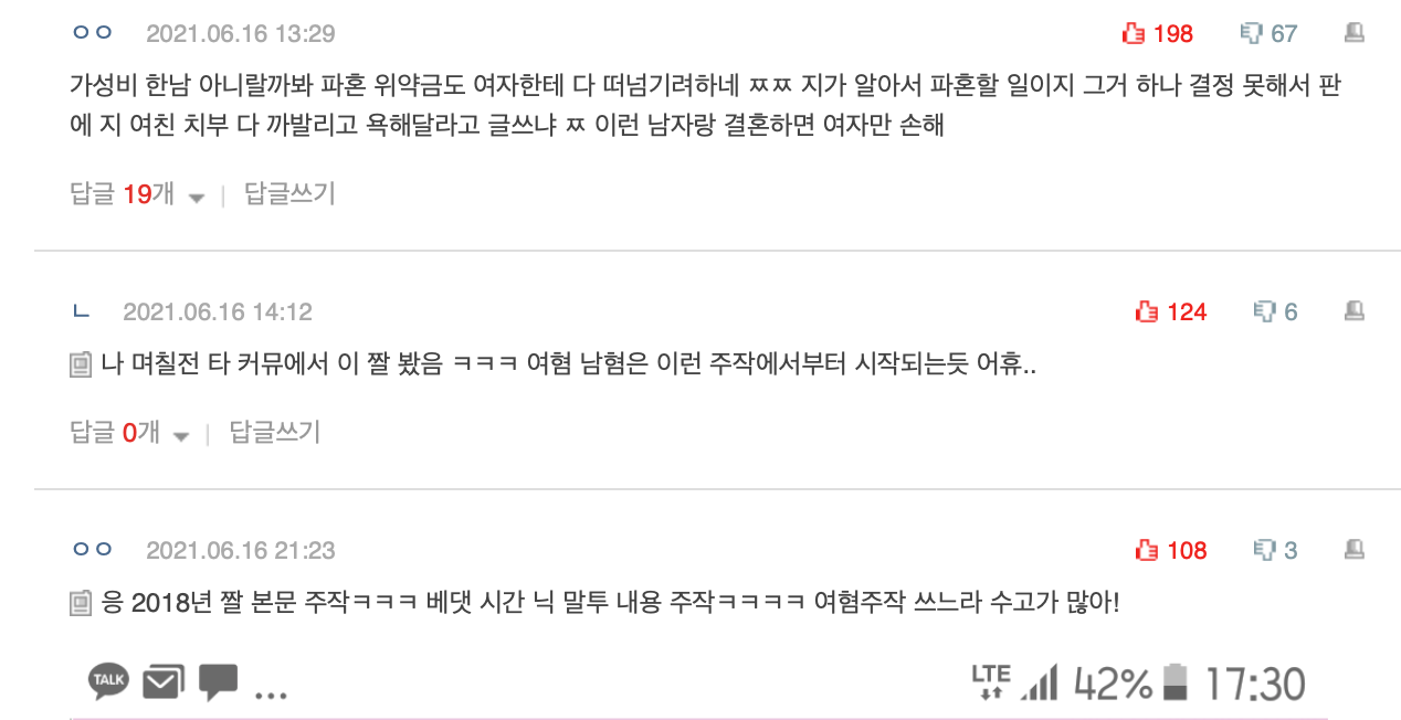 과거 카톡 내용에 소설쓴건데, 이전 베플들은 가관이었다