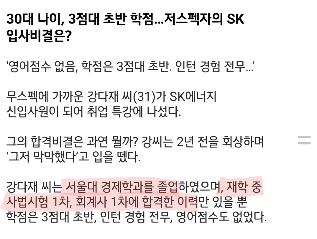 문과가 31살에 고시공부만 한거밖에 없으면 아무리 서울대라도 무스펙인건 맞지. 요즘 서율대가 예전 서울대도 아니고, 요즘 대기업 신입뽑지도 않는데 물론 다른 사람들은 무스펙이 아니라 마이너스 스펙