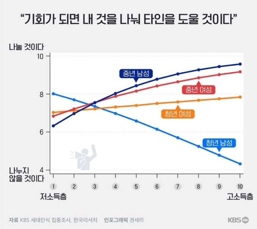 청년 남성은 부자일수록 자신이 가진 것을 나눌 생각이 없는 경향이 강했다.