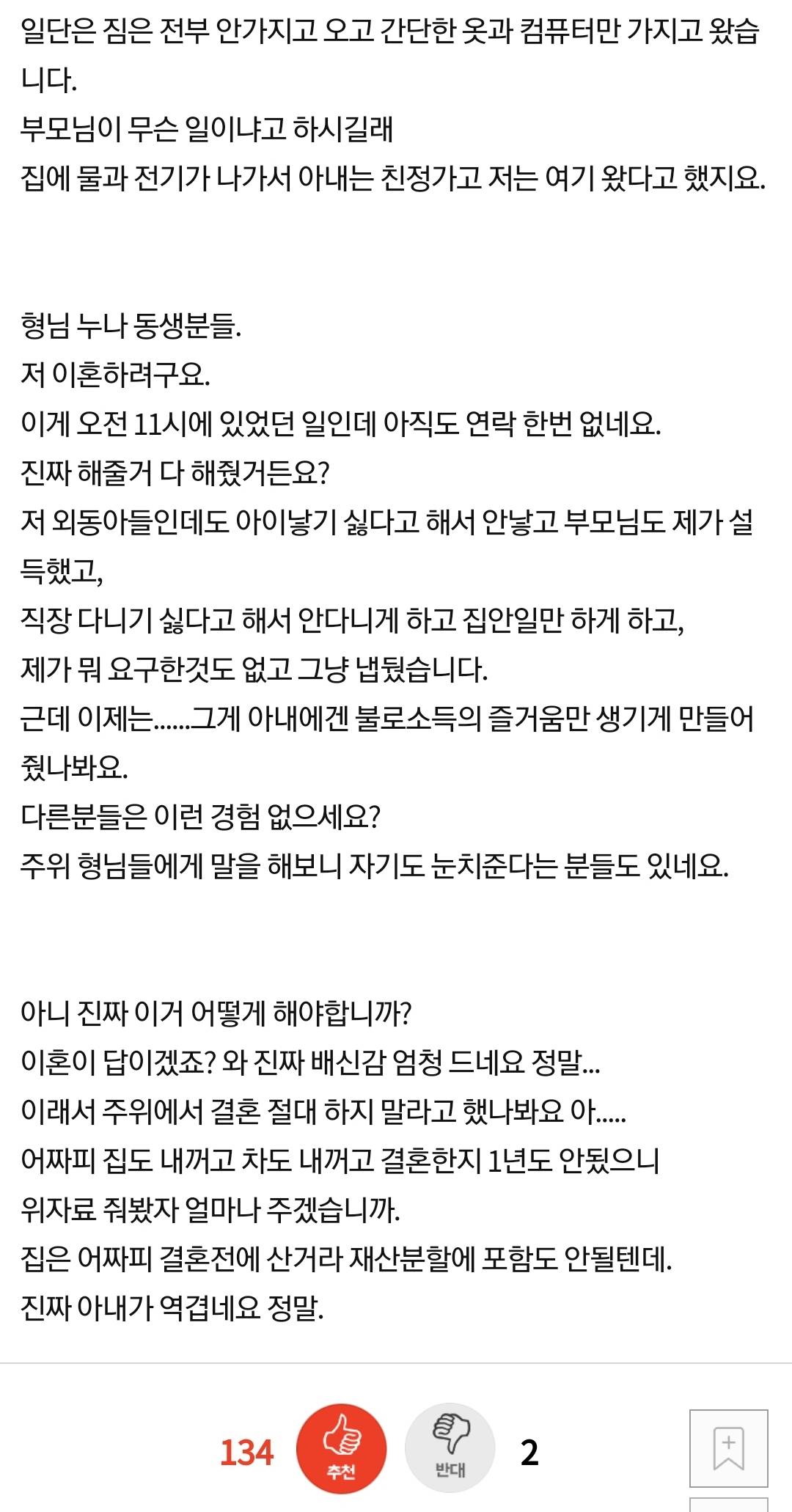 딱 1년~1년반인가 채우고 이혼하는게 이혼테크라며.. 그 이혼전문 변호사 글이랑 비슷한데? 수억 털리겠구만