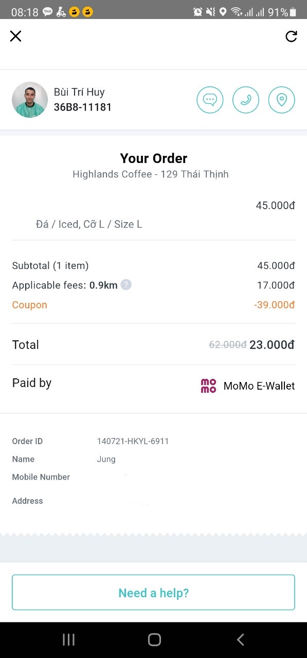 방금 아아 라지 사이즈 시켰는데 원래 가격은 45000 동 + 배달료 17000 동으로 62000 동이어야함.