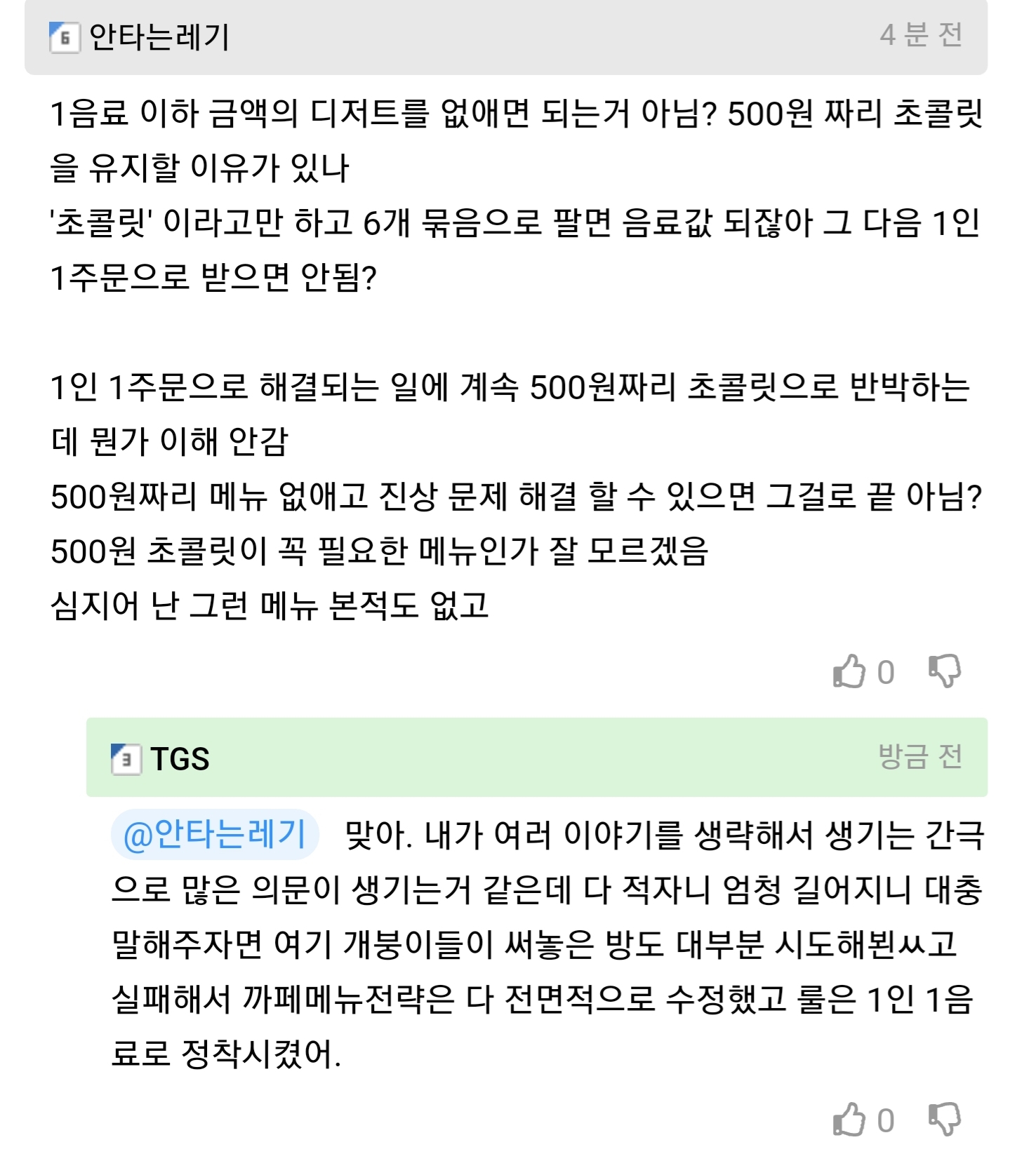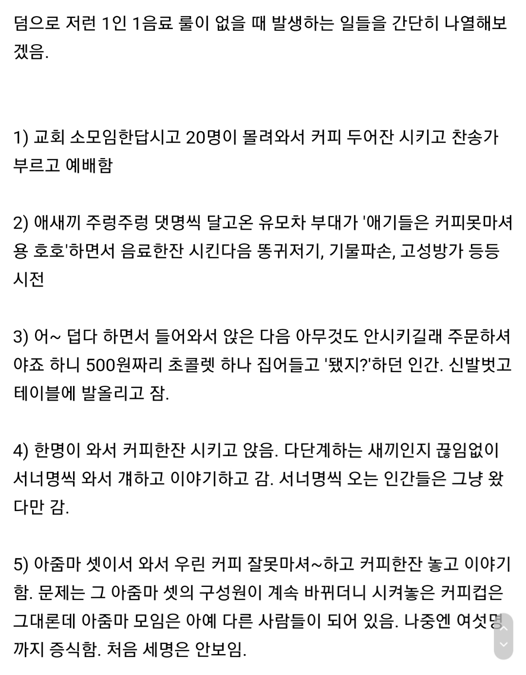 음 난 솔직히 공감 안된다 언급하는 모든 사례에 대해 그냥 단순히 '1인 1메뉴 주문해야 함' 으로 규칙을 변경하는 것 만으로 진상 컷 가능한데