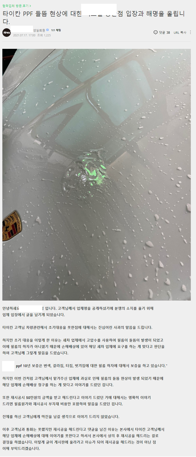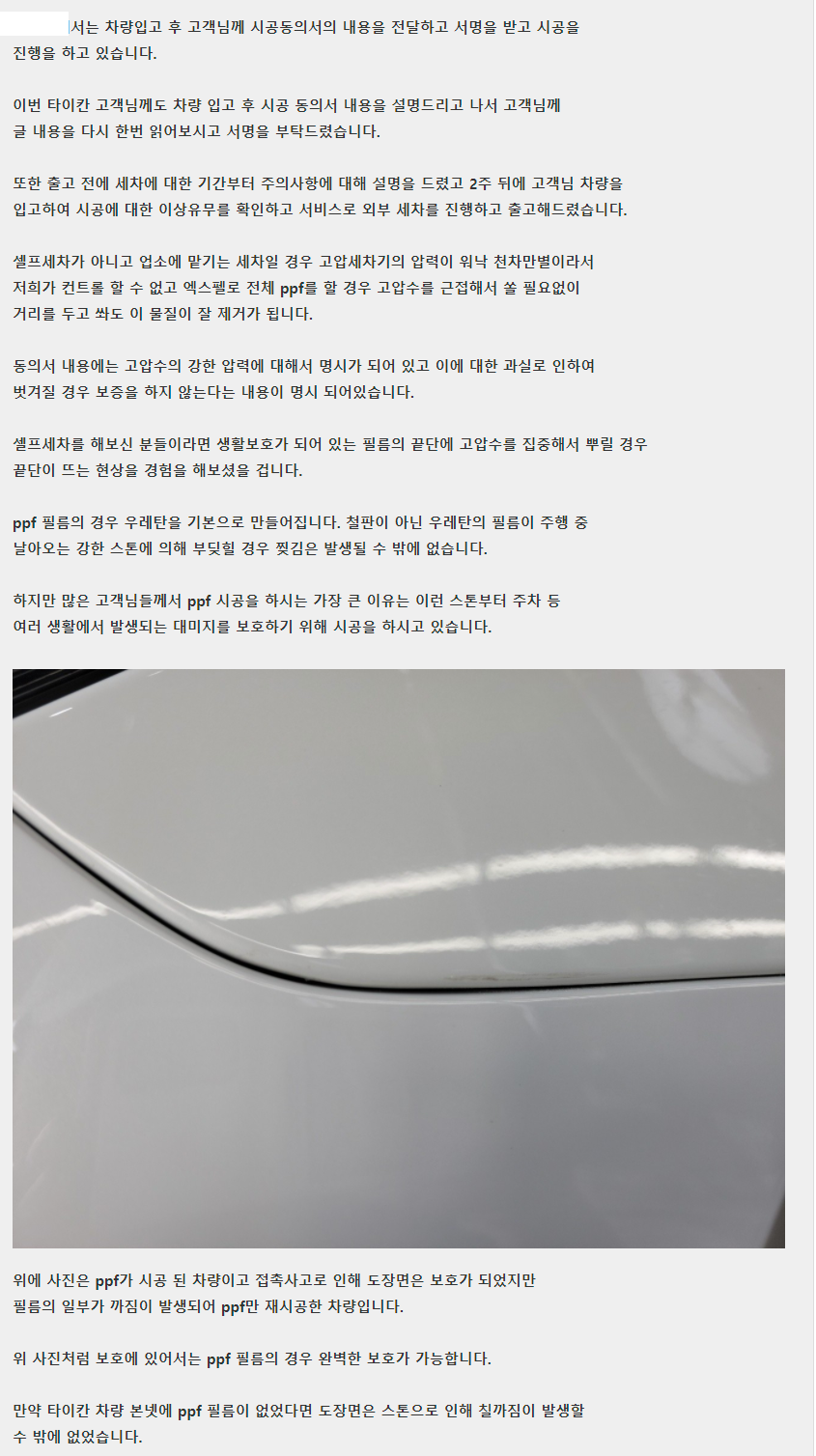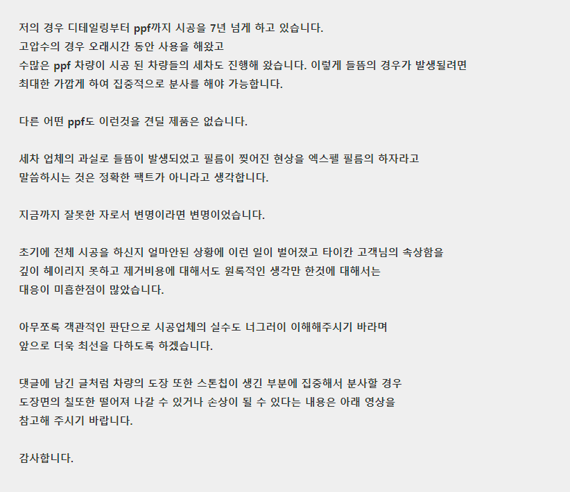 사장님께 "PPF했으니 고압수를 멀리서 쏴주세요" 라고 고지하신후에 세차를 하시기 바랍니다.