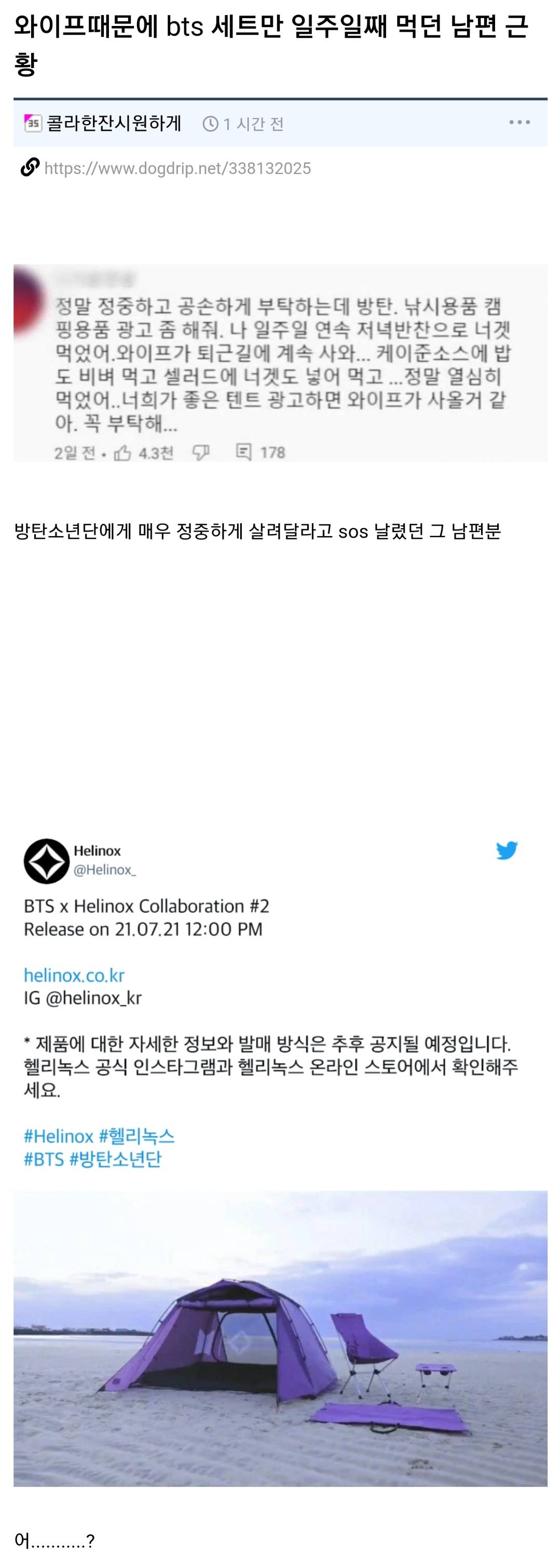 헬리녹스 bts콜라보는 그전에도 한거고 헬리녹스는 앵간한 콜라보 다 존나잘팔려서 사기도 힘듬.. 전에 bts콜라보 1초컷남 ㄹㅇ