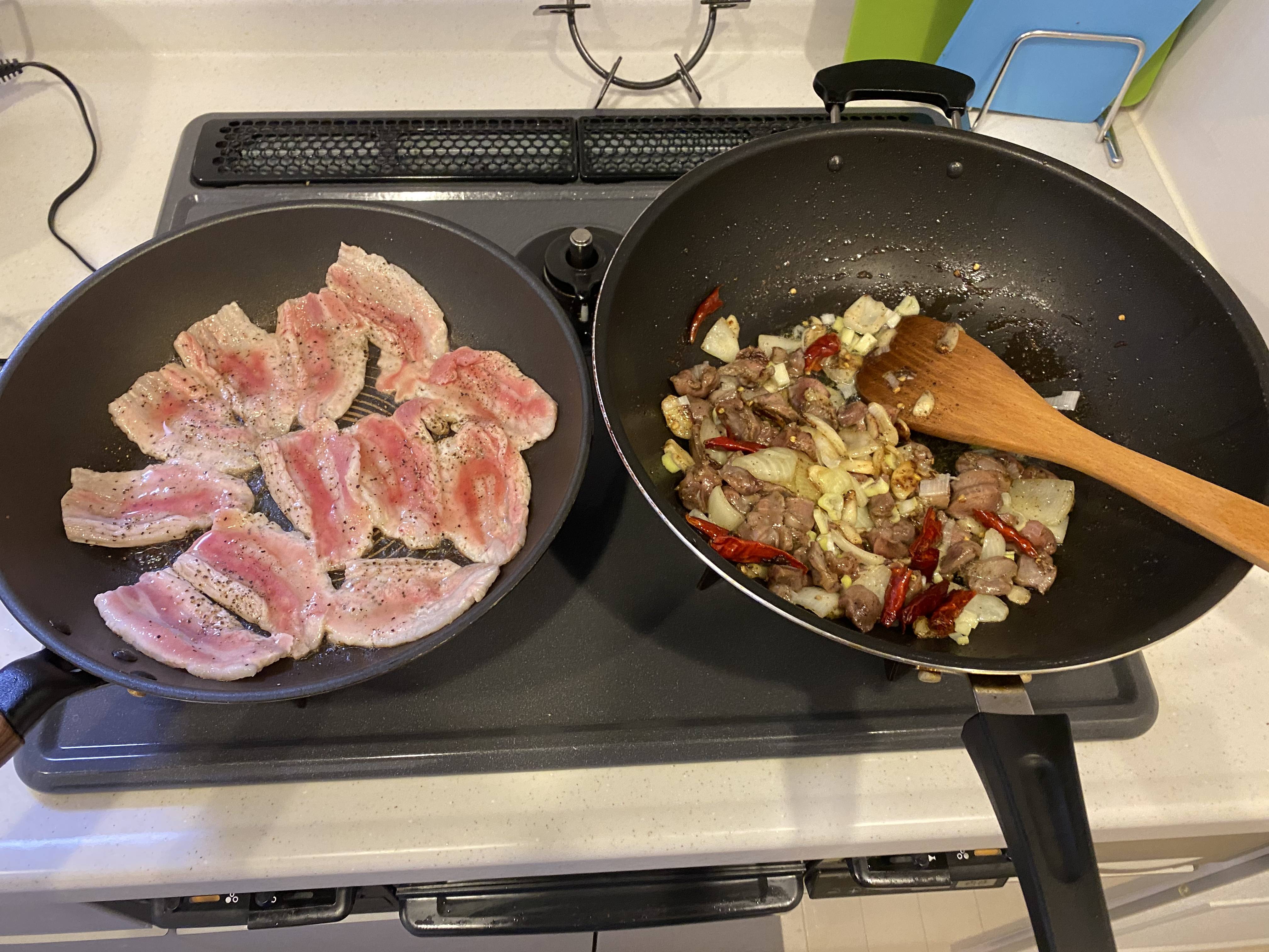 닭똥집마늘볶음에 삼겹살 구웠습니다