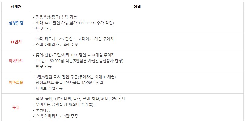 삼성닷컴 삼카11%할인에 삼성포인트4만주고 무이자24개월되서 조건은 나쁘지않음 다만 단독색상은 배송 젤빠른게 9월14일이라는것뿐