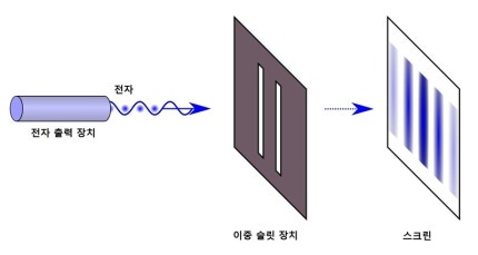 전자 출력 장치를 이용한 양자역학의 이중 슬릿 실험. 이중 슬릿 판의 좁은 두 구멍 사이를 통과한 전자는 스크린에 여러 줄의 간섭무늬를 만든다. 이는 전자가 입자일 뿐 아니라 파동으로도 존재한다는 사실을 입증한다. 그런데 전자가 슬릿에서 어느 쪽 틈을 통과하는지 확인하려 슬릿 판 앞에 전자 검출기를 설치하면 스크린에 간섭무늬가 아닌 뚜렷한 두 줄의 무늬가 나타난다. 이처럼 관찰 행위는 전자의 운동에 영향을 주어 관찰 결과를 바꾼다. 위키미디어 코먼스