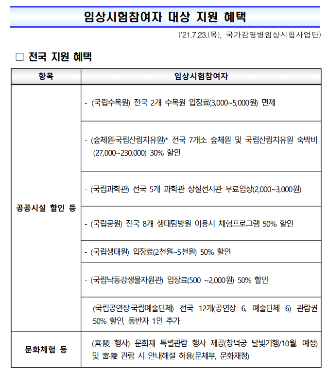 정부가 국산 코로나19 백신 개발을 위해 임상시험 참여자에 국립 수목원·과학관·공연장 등의 입장료 감면·할인 혜택을 제공하기로 했다.