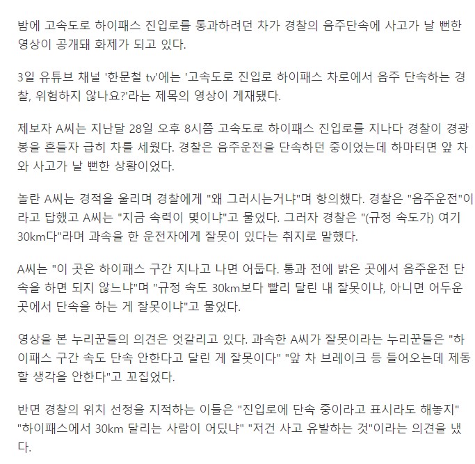저건 경찰 실수 맞음. 하이패스 지점에서 단속 원래 자주 하던데. 저렇게 위험하겐 안 하던데. 다른데 빠지는 거 방지할수 잇게 멈춰선 지점보다 더 앞에 한 명 정도 더 세워놓던데..
