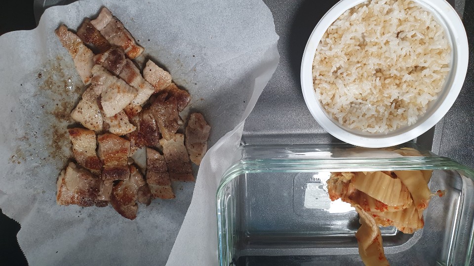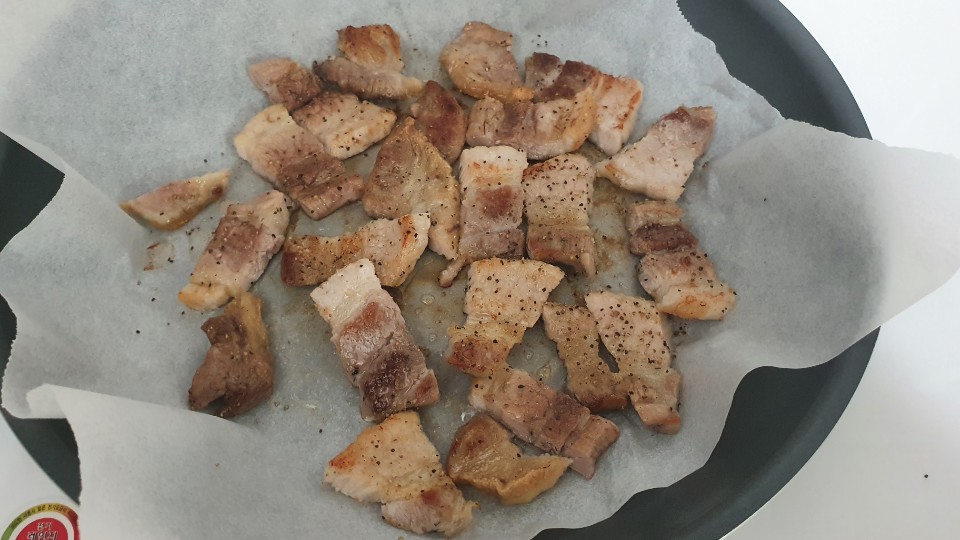 에어프라이어로 기름기뺀 삼겹살에 물에씻은 묵은지