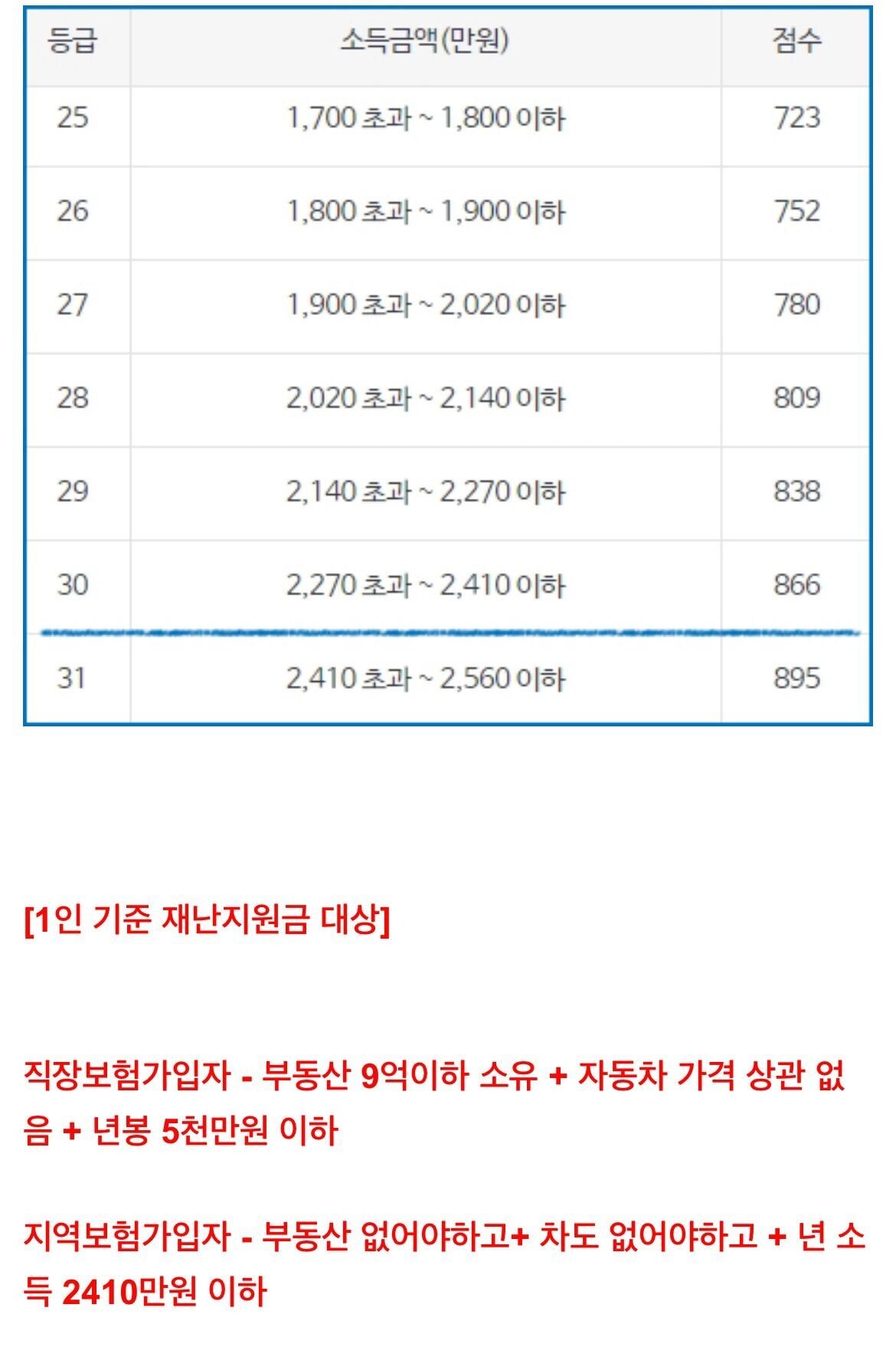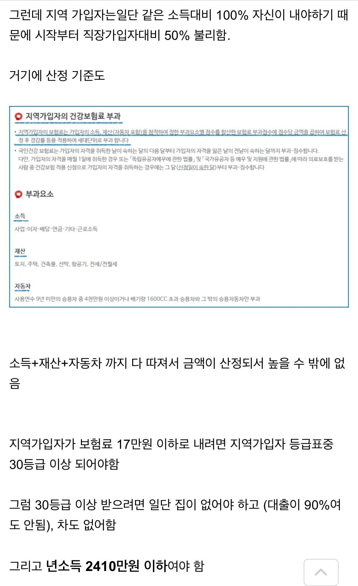 지역가입자 기준 나도 이거보고 찾아봤는데 부동산/자동차 비중이 들어가는 것도 가는거지만 기본적으로 소득이 2000~3000만 돼도 커트라인에 걸리는게 맞네