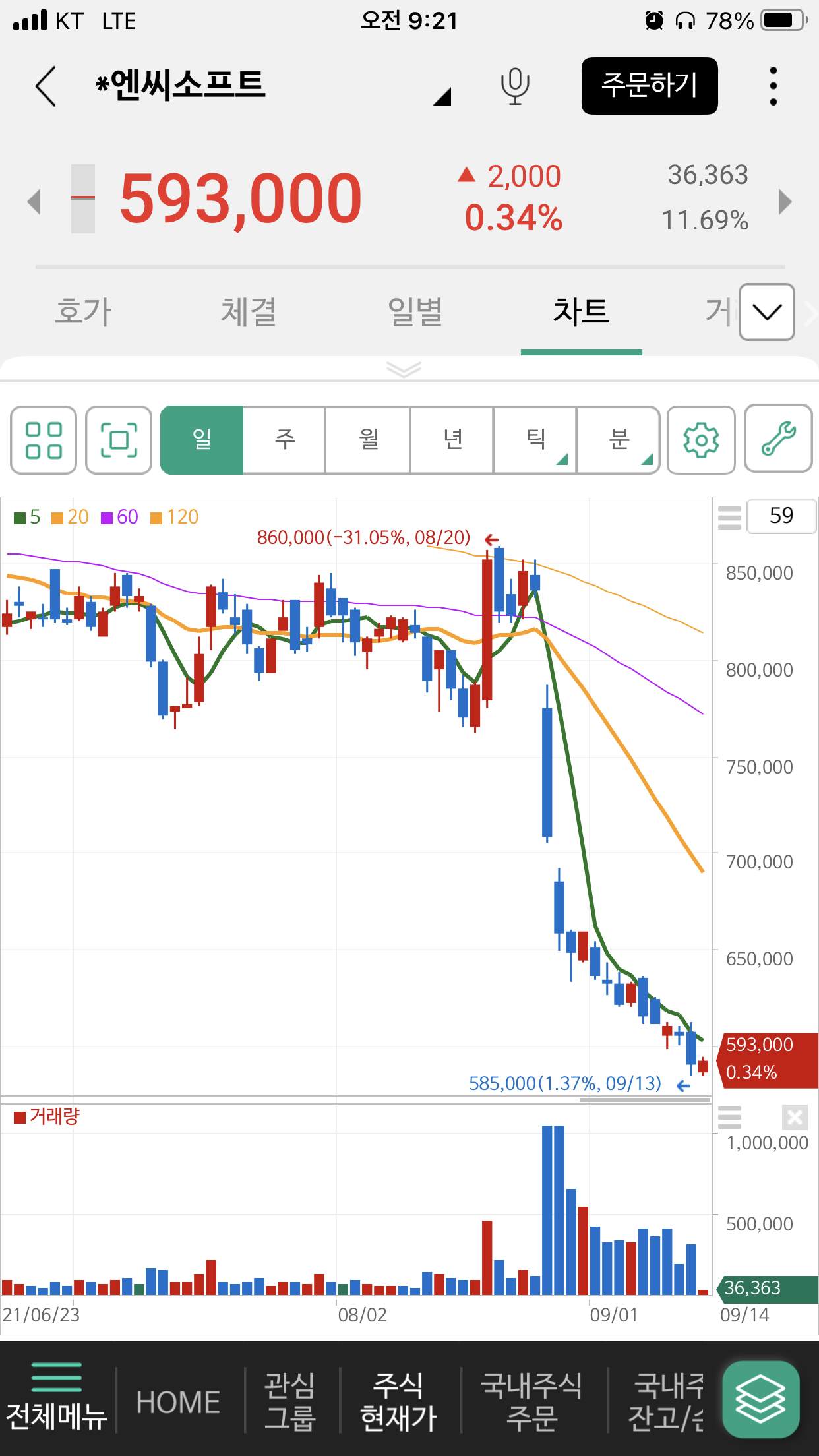 그냥 차트만 보면 최소한 50중후반까진 더 떨어지다가 보합 혹은 약반등할거같음