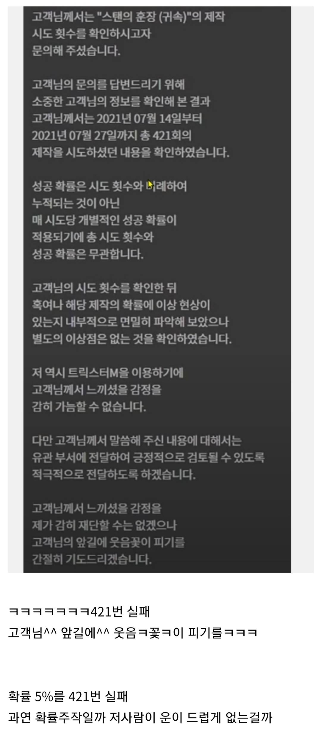 미쳤나 씨발새끼들이 5%확률을 421번 실패하려면 확률이 0.00000004% 인데