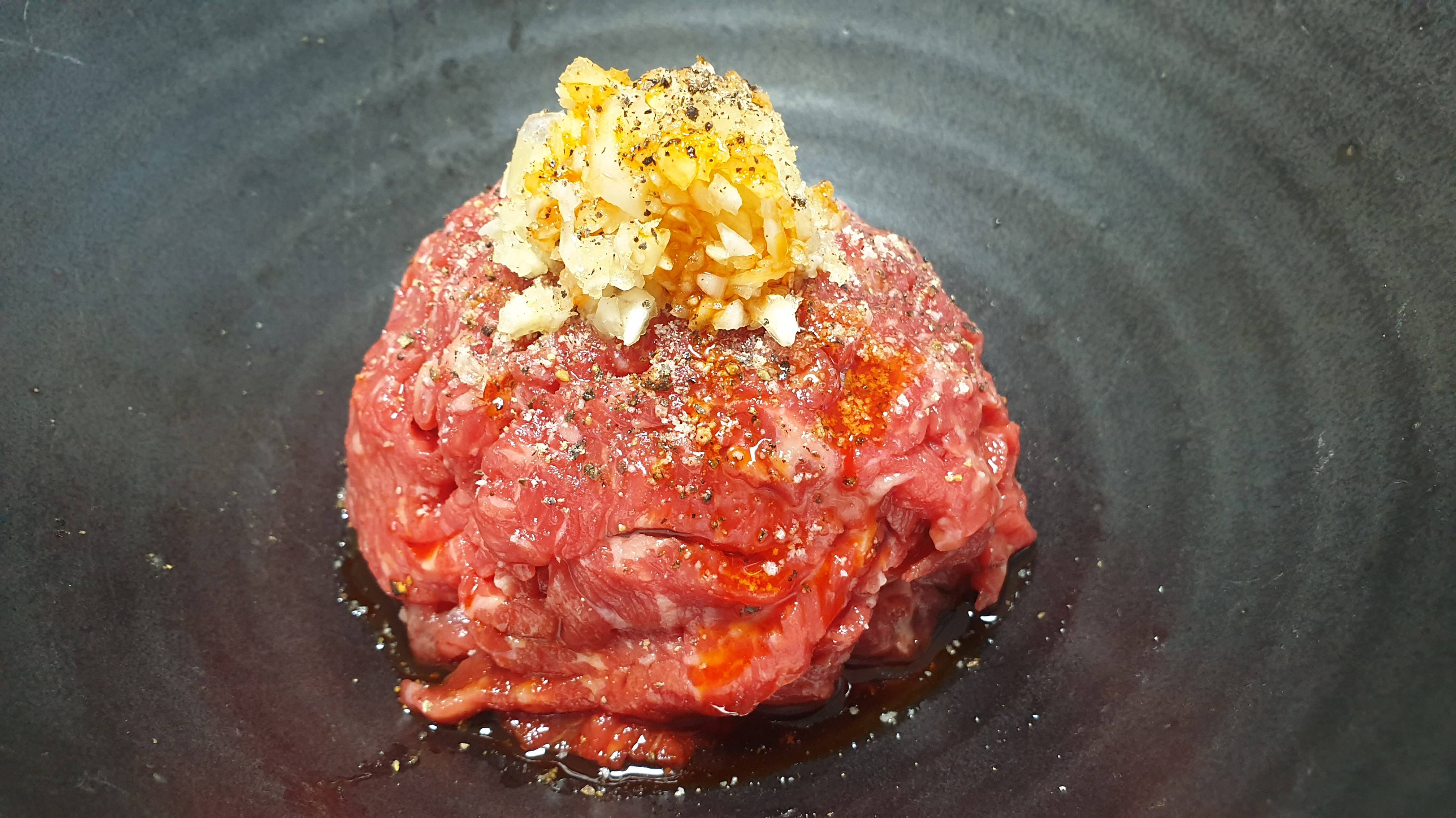 저 육회는 진간장 마늘 설탕 참기름으로 무치고 위에 고추기름 살짝 통후추 대파 흰 부분 채 썰음