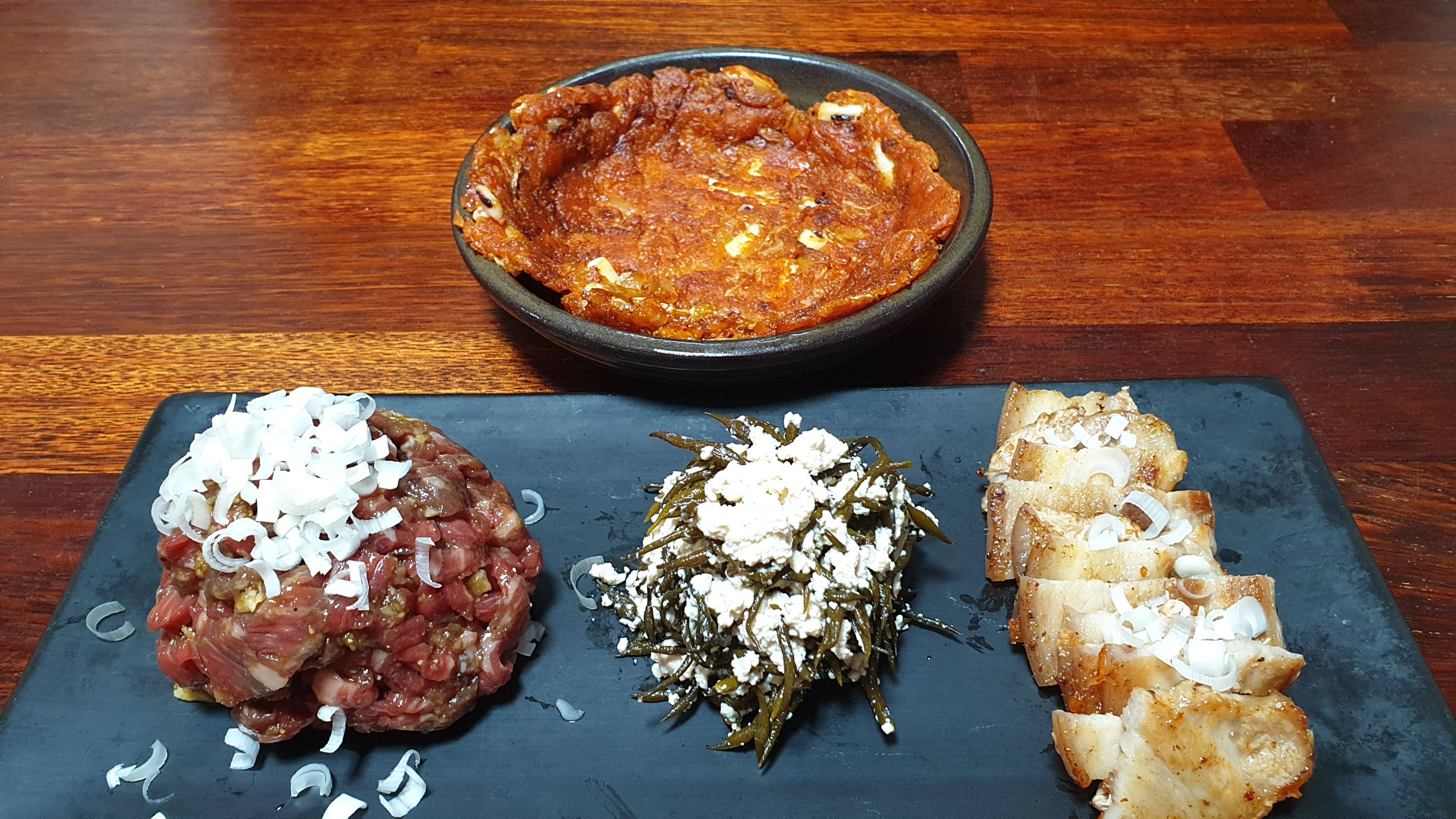 김치부침개 왼쪽 육회임? 중간에있는건 이름이머임