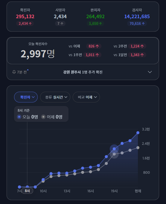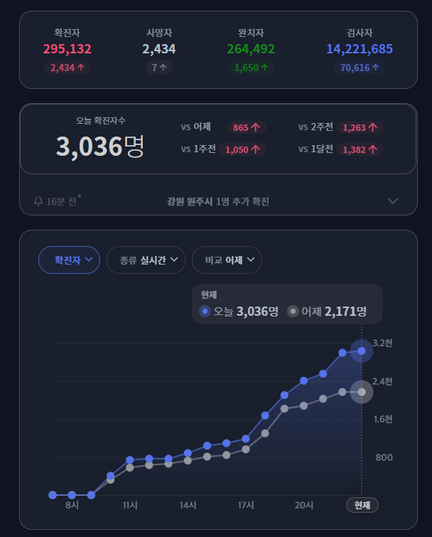 전날은 서울 900명에서 오늘은 서울만 1200명으로 기록인데 이번엔 전국다 올라버림