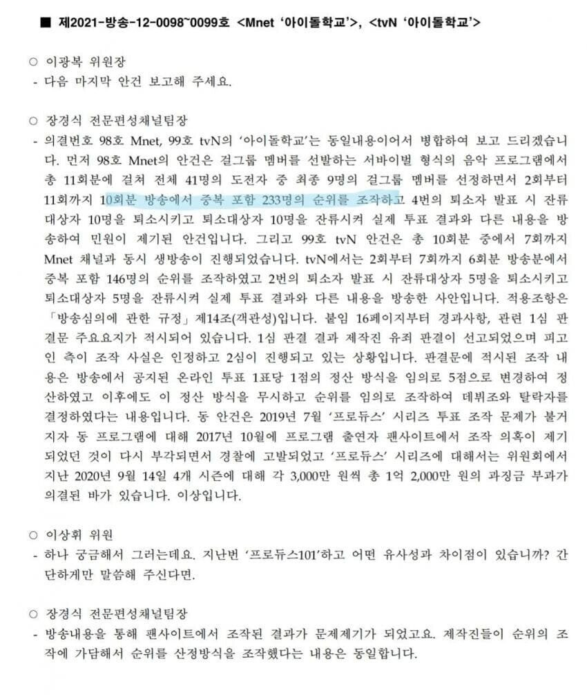 2회부터 11회 총 10회분까지 중복포함 233명 순위 조작