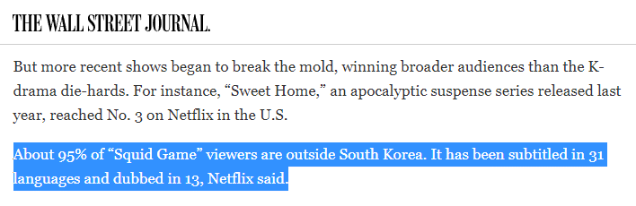 월스트릿 저널 - 넷플 피셜, 구독자중에서 오징어 게임 시청한 사람의 95%가 한국 제외한 해외지역